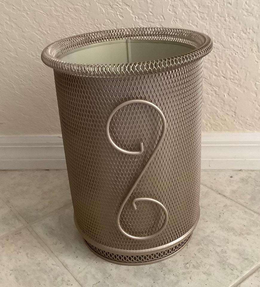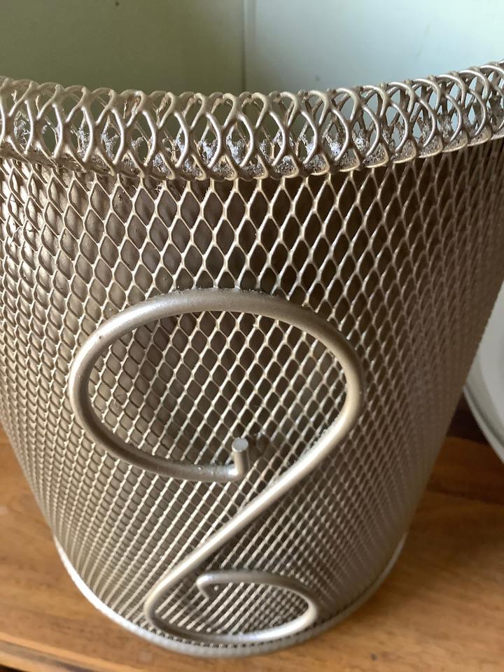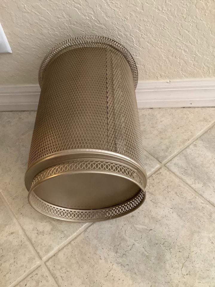 ตะกร้าขยะโลหะสไตล์วินเทจกลางศตวรรษพร้อมลวดลายตกแต่ง เหมาะสำหรับใช้ในสำนักงาน ห้องครัว และพื้นที่สาธารณะ