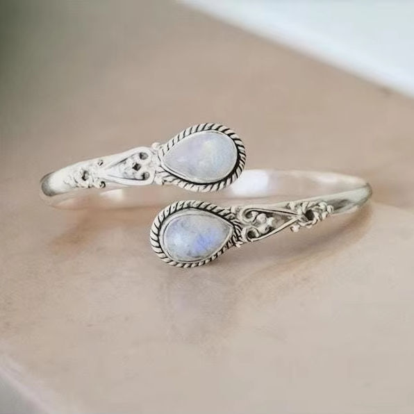 กำไลข้อมือมูนสโตนวินเทจ เงินแท้ ทำมือ ปรับขนาดได้ เครื่องประดับผู้หญิง สไตล์โบฮีเมียน ดีไซน์แบบชาติพันธุ์ ของขวัญงานแต่งงานสุดหรู