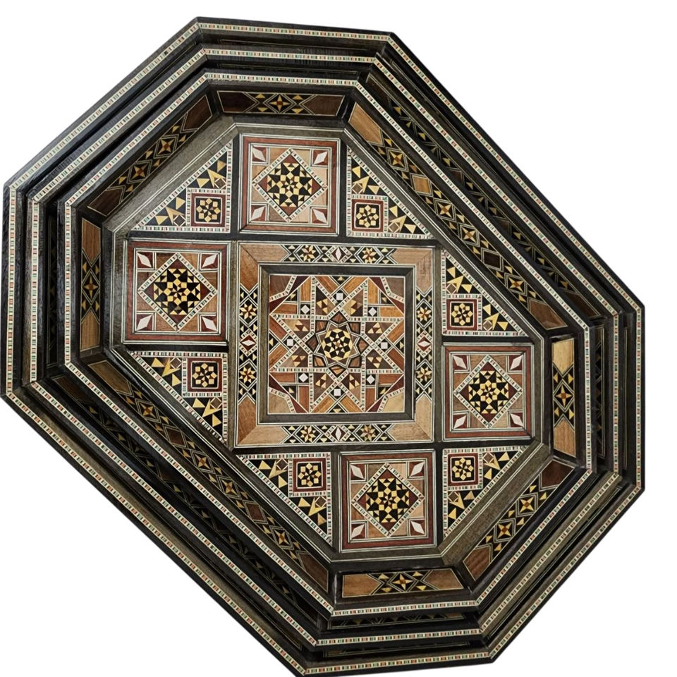 ชุดถาดเสิร์ฟไม้ทรงแปดเหลี่ยมสไตล์โมร็อกโกโบราณ ฝังไม้วอลนัทแกะสลักด้วยมือ พร้อมถาดฝังมุกทำมือ