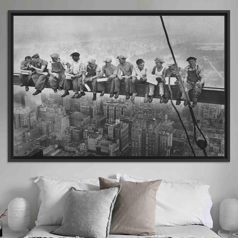 ภาพพิมพ์บนผ้าใบแนววินเทจเกี่ยวกับการก่อสร้างในนิวยอร์ก: ภาพศิลปะคนทานอาหารกลางวันบนตึกสูง, ภาพพิมพ์บนผ้าใบกรอบสีดำ