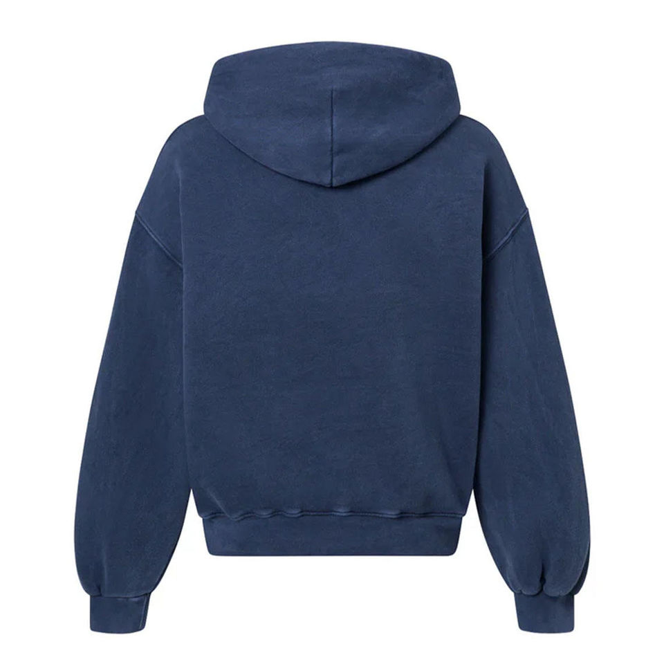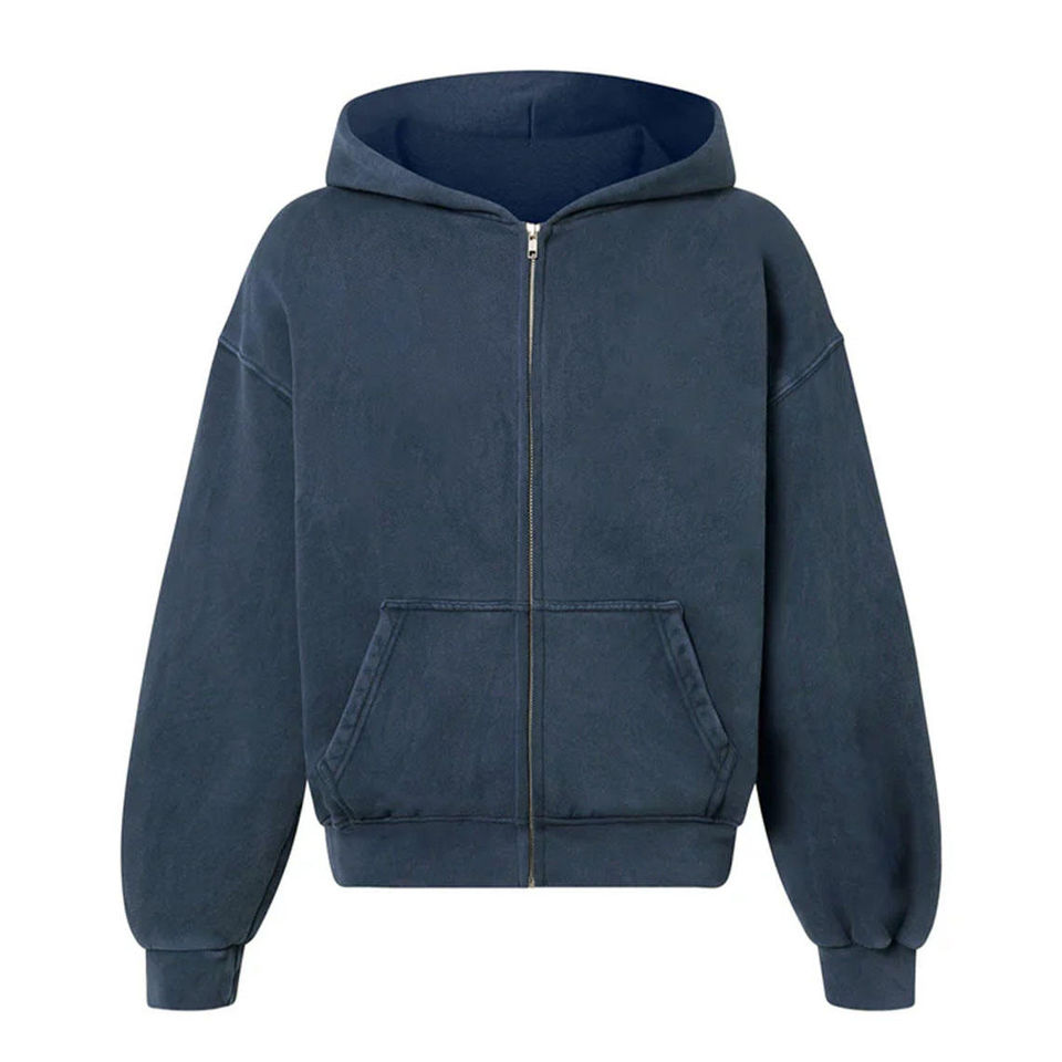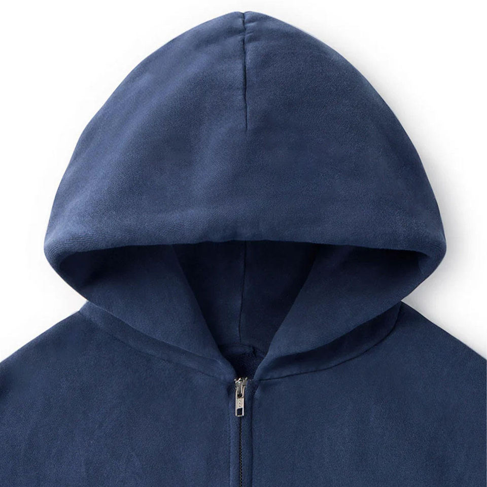 เสื้อฮู้ดซิปสีน้ำเงินกรมท่าสไตล์วินเทจ ผ้าฝ้าย 100% หนา 450 GSM แห้งเร็ว ทรงโอเวอร์ไซส์ สตรีทแวร์ ผ้าฟลีซหนานุ่ม ตกแต่งลูกปัด ไหล่ตก