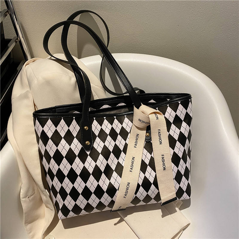 กระเป๋าโท้ททรงใหญ่ลายตารางเพชร PU วินเทจ ปิดแบบเปิด แต่งหมุด ดีไซน์เนอร์สำหรับผู้หญิง สายสะพายเดี่ยว ซับในโพลีเอสเตอร์ ปี 2024