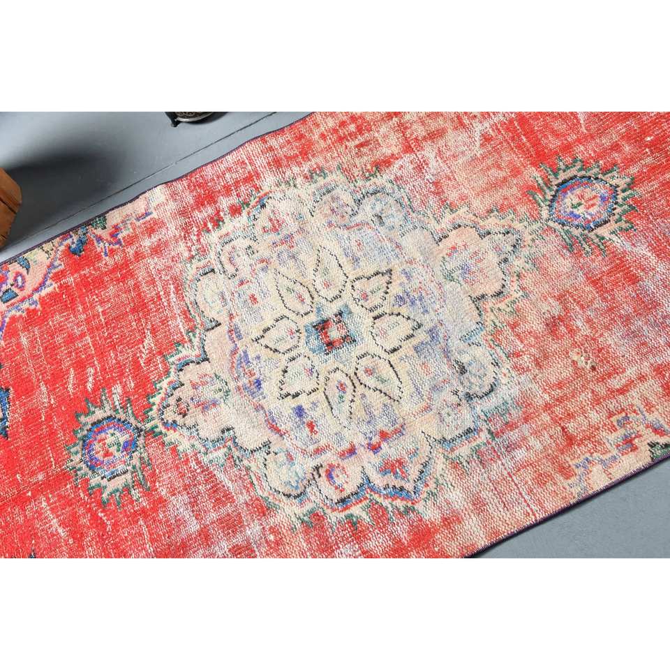 พรมขนสัตว์เย็บปะแบบวินเทจขนาด3.1x5.9ฟุตทอแบบตุรกีพรมสำหรับห้องนั่งเล่นสีแดงและสีเบจพร้อมลาเท็กซ์ด้านหลัง