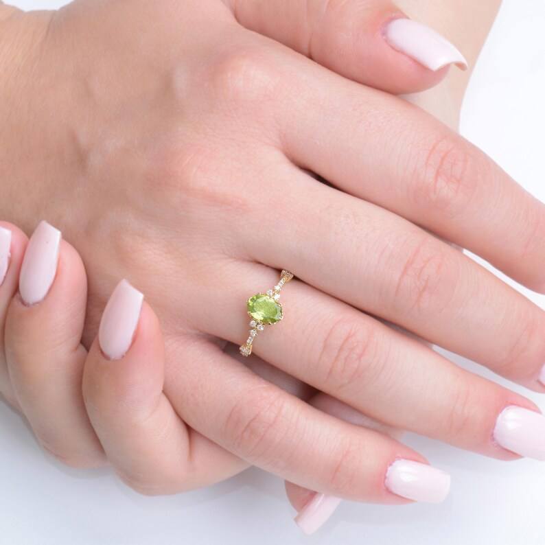 แหวนหมั้นเพอริดอทดีไซน์วินเทจ รูปไข่ สีเหลือง ได้รับการรับรอง สีเขียว แหวนแต่งงานเพอริดอตแท้ เงินแท้ 925 ชุบทอง 14K
