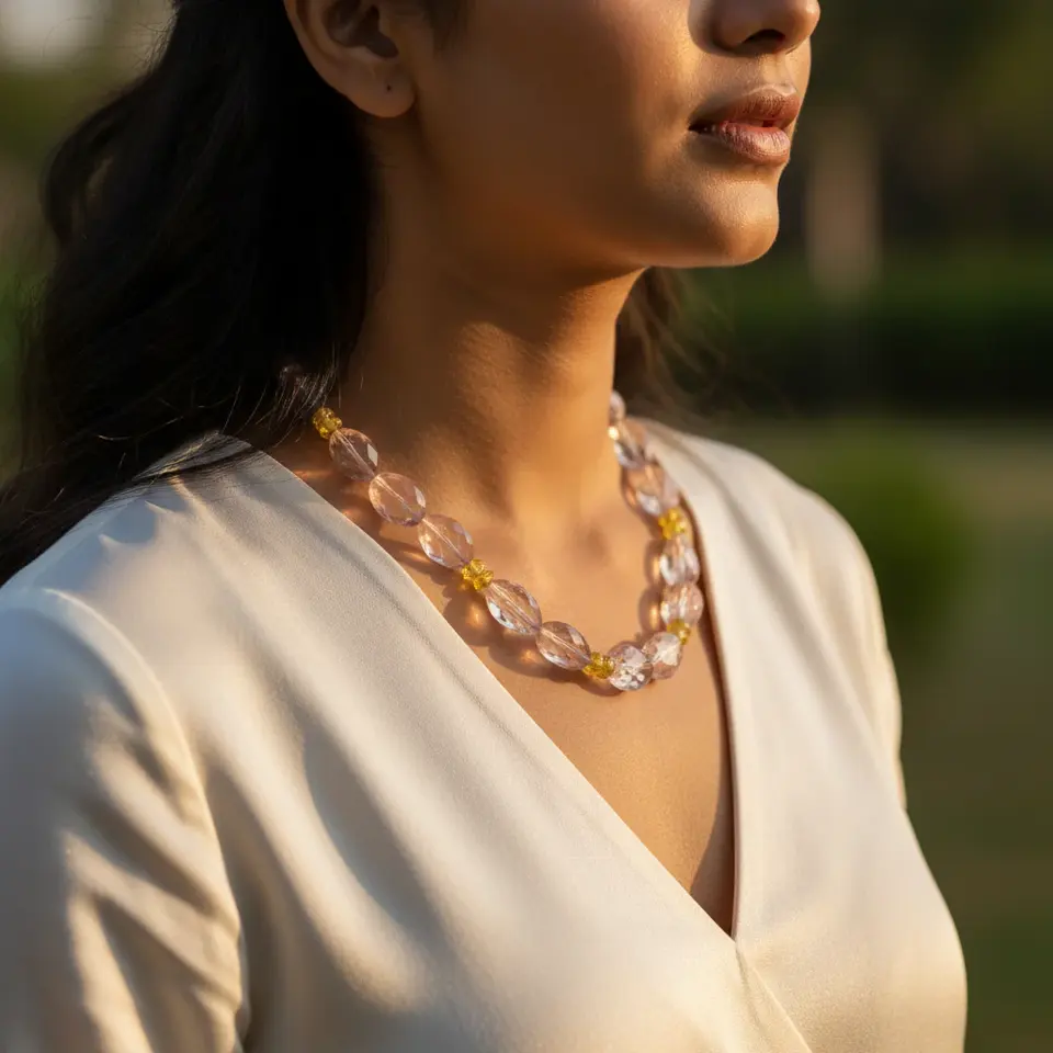 สร้อยคอลูกปัดควอตซ์สีชมพูและสีเหลืองสไตล์วินเทจสำหรับผู้หญิง-ไอเดียของขวัญ