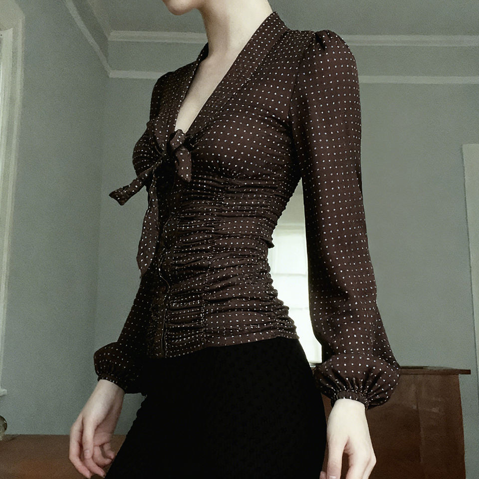 เสื้อยืดวินเทจลายจุด คอวีผูกโบว์ ผู้หญิง ทรงเข้ารูป แขนยาว จับจีบเอว ดีไซน์หรูหรา สไตล์เรโทรลำลอง