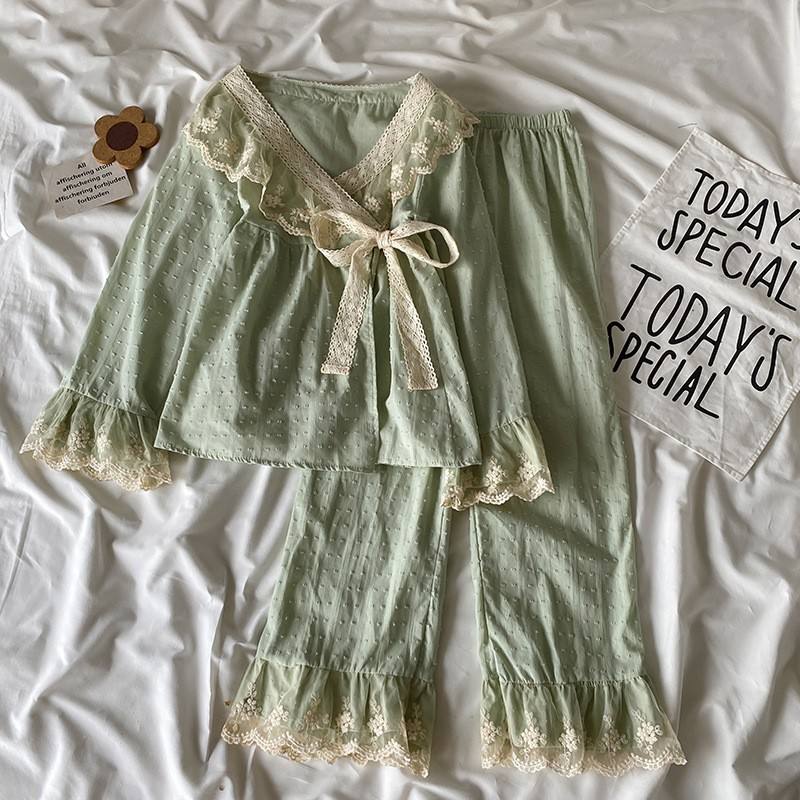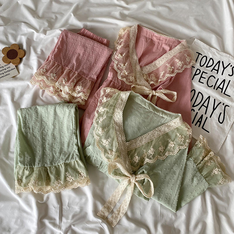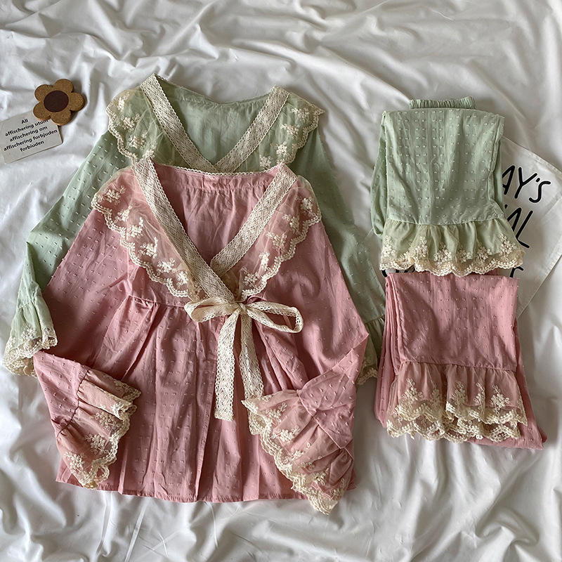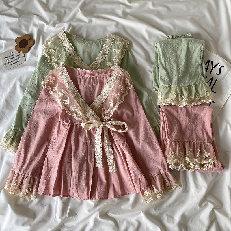 ชุดนอนผู้หญิงสไตล์วินเทจผ้าลูกไม้แขนยาวชุดกิโมโนเอวยางยืดชุดใส่อยู่บ้านสำหรับฤดูใบไม้ผลิฤดูใบไม้ร่วง