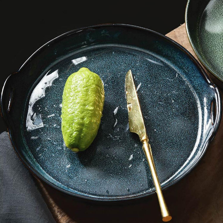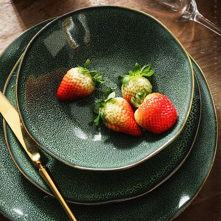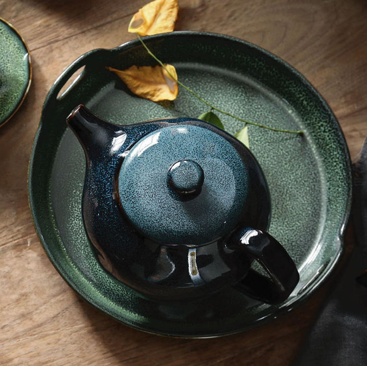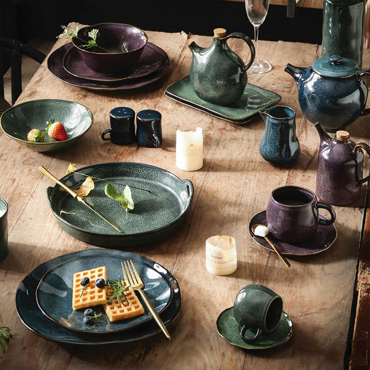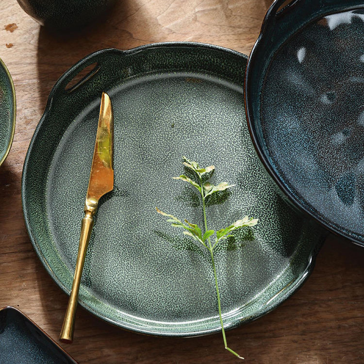 วินเทจเคลือบปฏิกิริยาสีเขียวสีฟ้าพอร์ซเลนบนโต๊ะอาหารเซรามิกชุดอาหารค่ําชุดจานชุดอาหารเย็นสําหรับร้านอาหาร