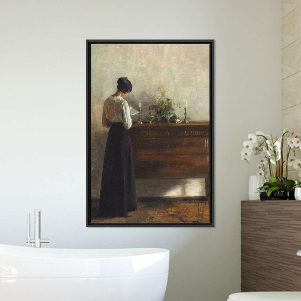ศิลปะบนผืนผ้าใบพิมพ์ลายแนววินเทจสมจริง ฉากภายในที่เงียบสงบสำหรับตกแต่งบ้าน กรอบสีดำ