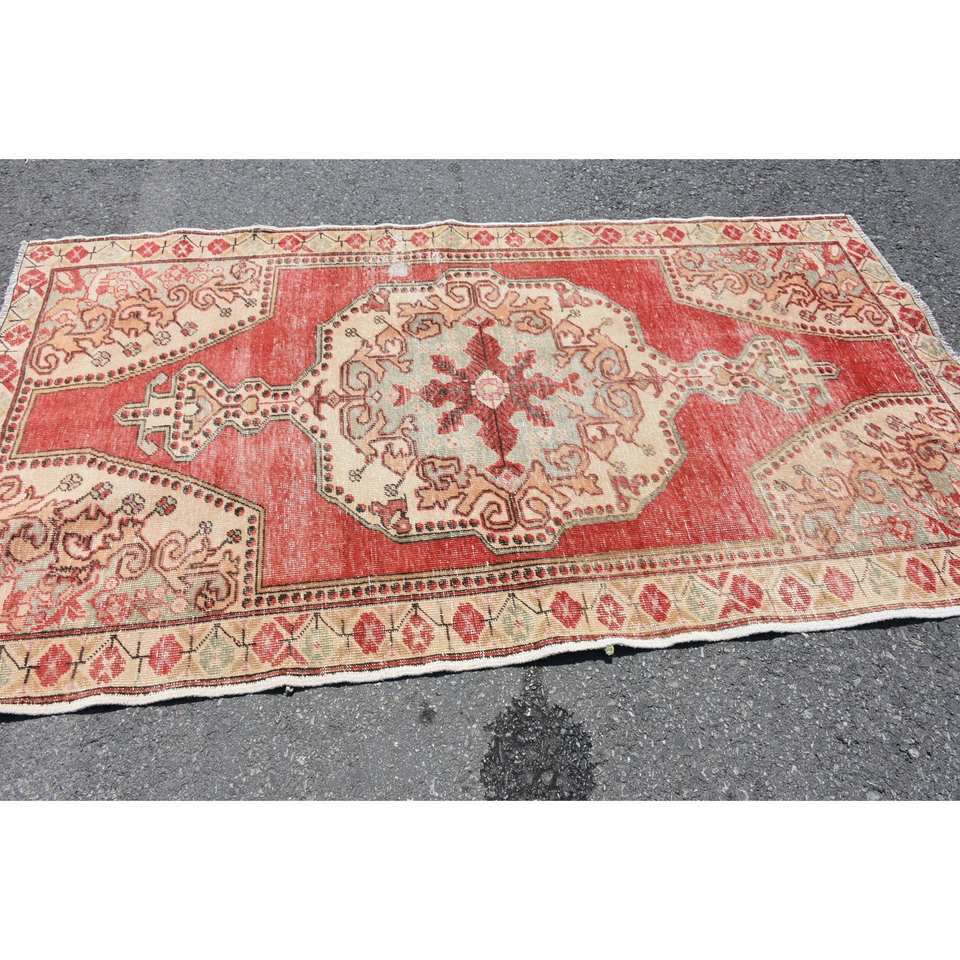 พรมขนสัตว์สีเบจสีแดงสไตล์วินเทจขนาด4.6X8ฟุตงานแฮนด์เมดสไตล์ตุรกีทรงสี่เหลี่ยมมุมฉากสำหรับห้องนั่งเล่น