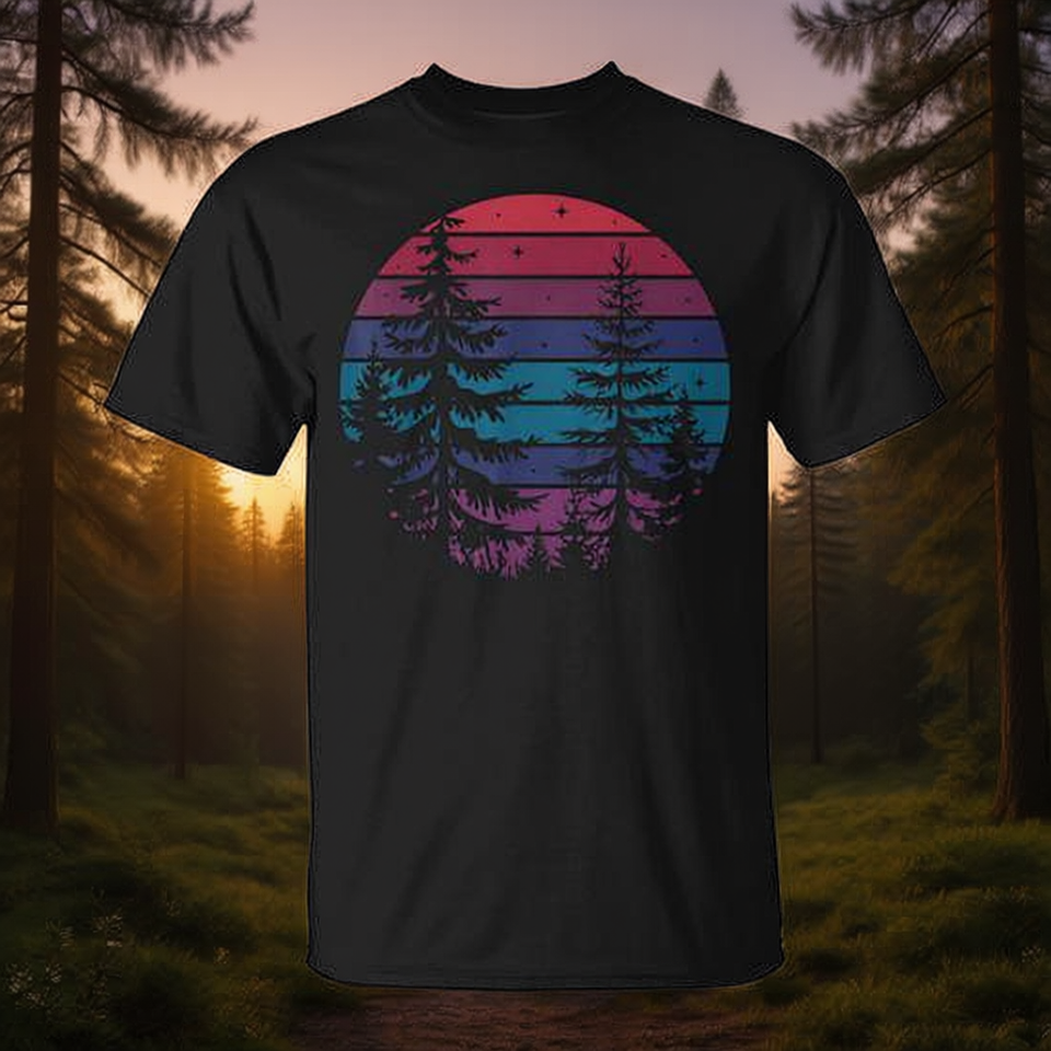 เสื้อยืดดีไซน์วินเทจเรโทรพระอาทิตย์ตกป่าต้นสนกลางแจ้งธรรมชาติ