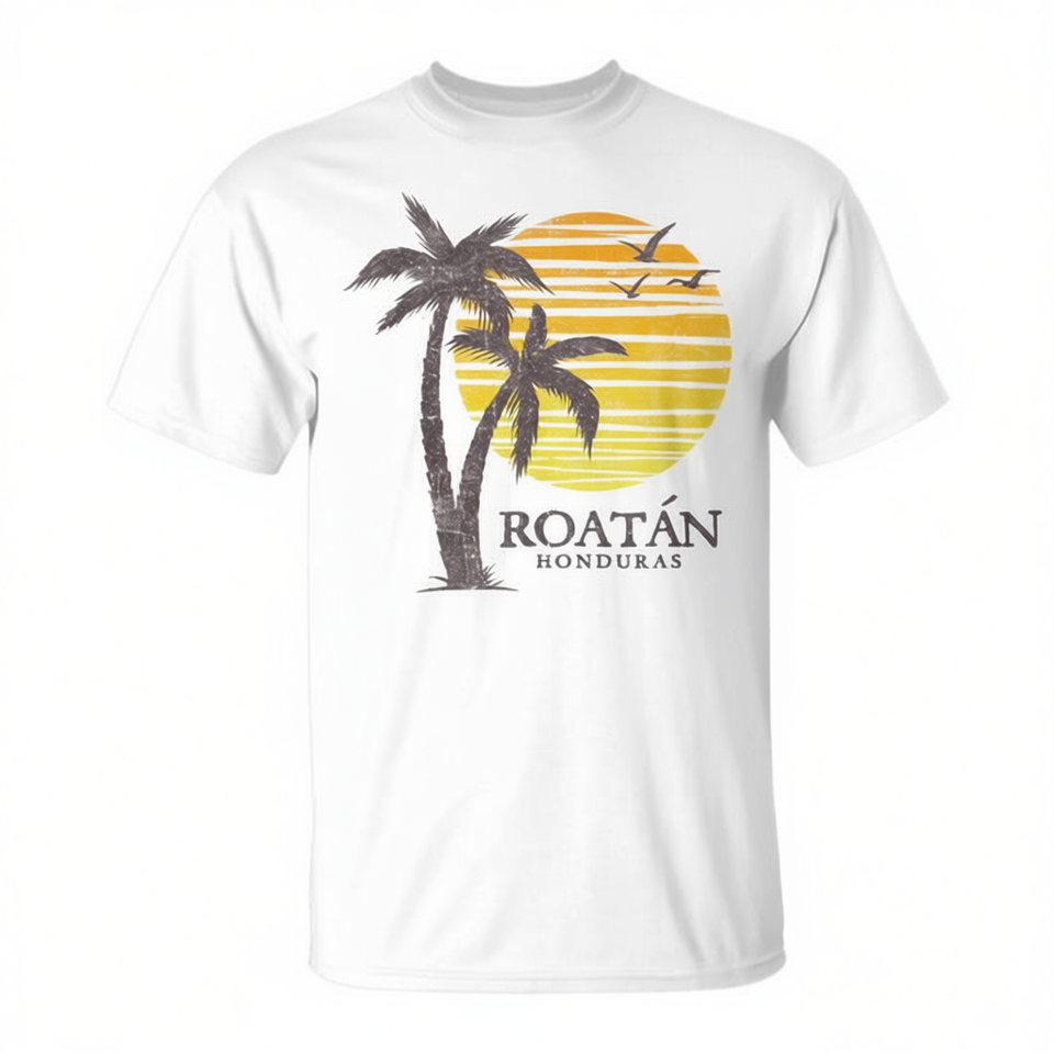 เสื้อยืดของที่ระลึกวินเทจ โรตัน ฮอนดูรัส ชายหาดยามพระอาทิตย์ตก สินค้าส่งเสริมการขายระดับพรีเมียม