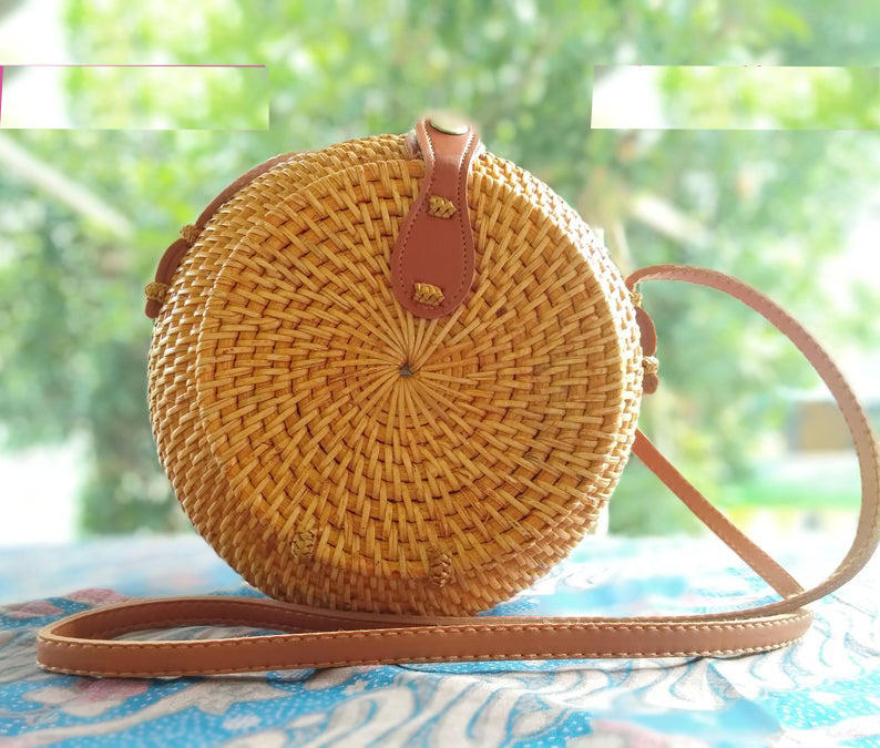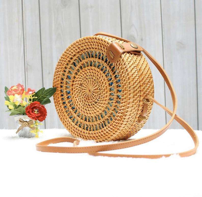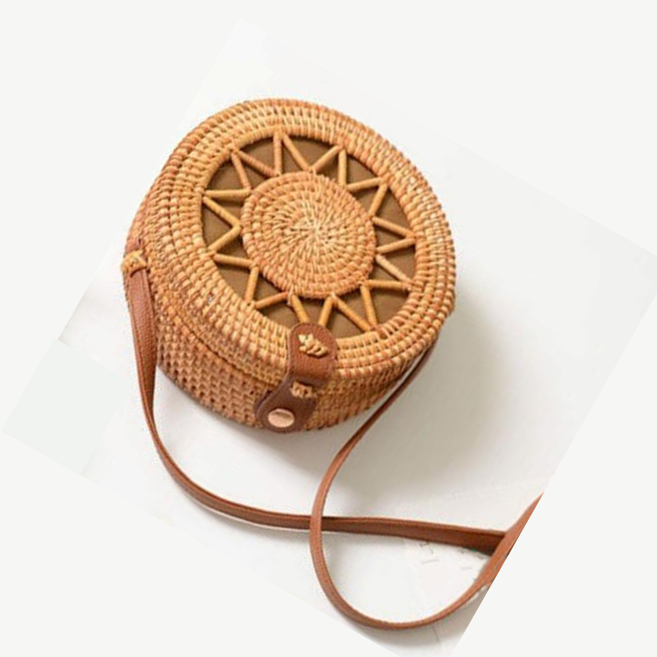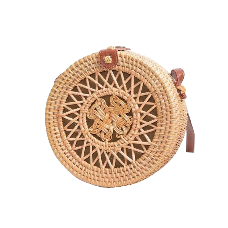 กระเป๋าถือหวายทอมือทรงกลมวินเทจสําหรับผู้หญิงลายธรรมชาติพร้อมสายหนังล็อคปุ่ม Rivet คุณภาพสูง FBA Amazon