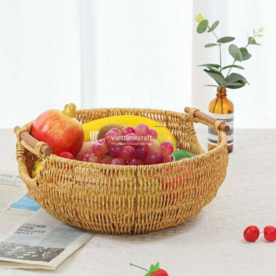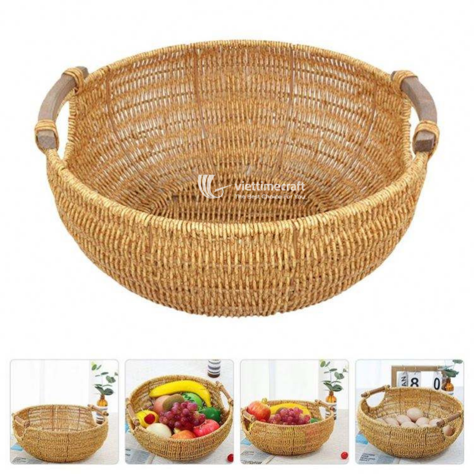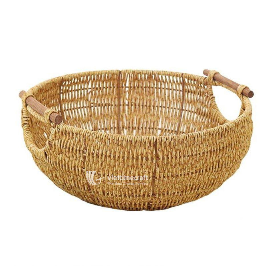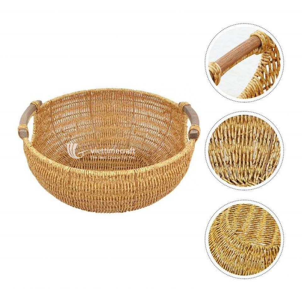 ชามหวายทรงกลมวินเทจพร้อมหูจับไม้คู่ ถาดเสิร์ฟแบบตาข่ายสานธรรมชาติรักษ์โลกสำหรับขนมปังและของว่าง