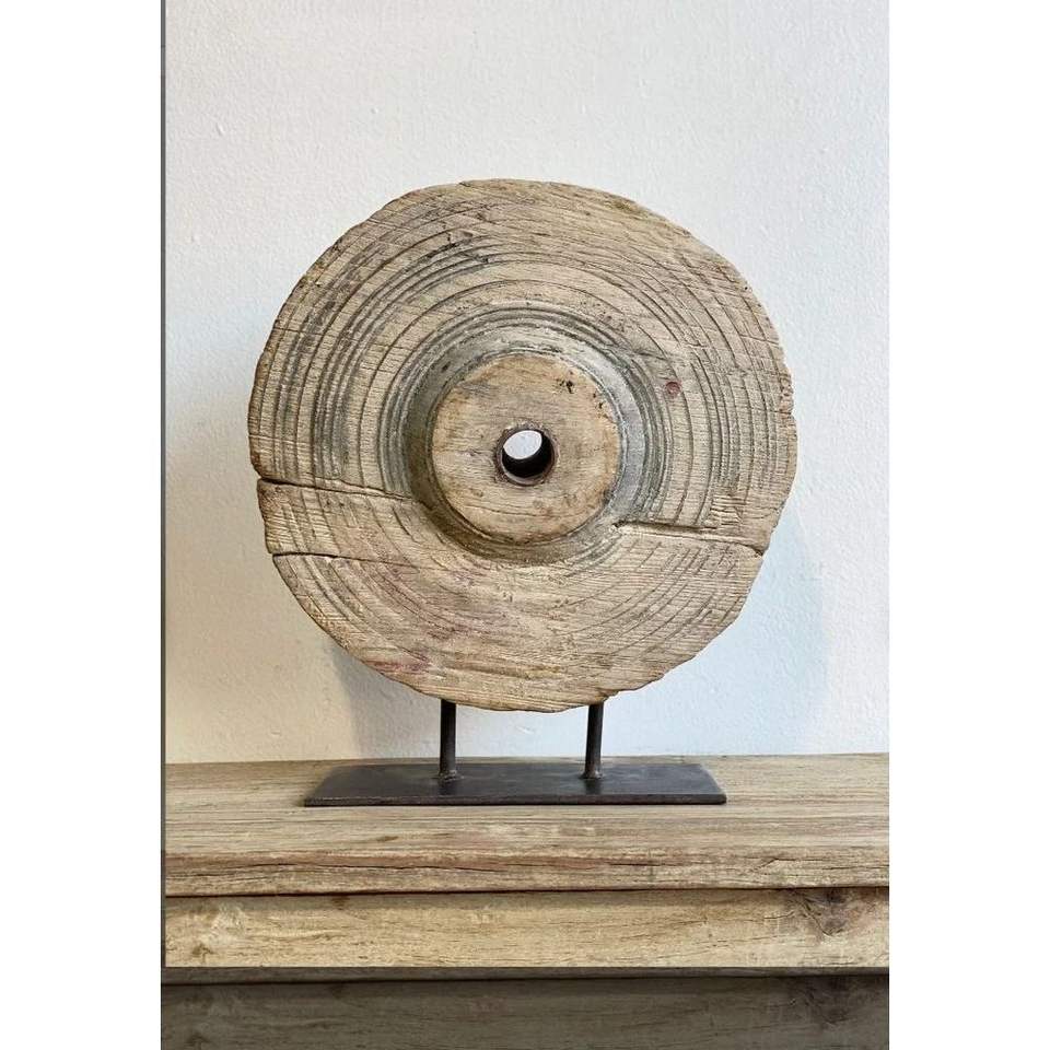ล้อไม้สักทรงกลมแบบวินเทจพร้อมขาตั้งเหล็ก ดีไซน์เรียบง่ายสไตล์ชนบท สำหรับตกแต่งบ้านในเทศกาลดีวาลี ไม่มีที่เก็บของ