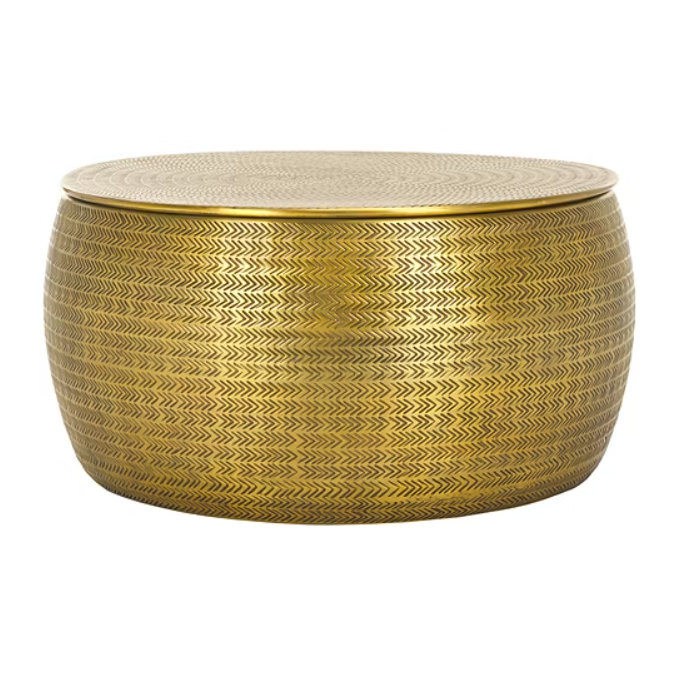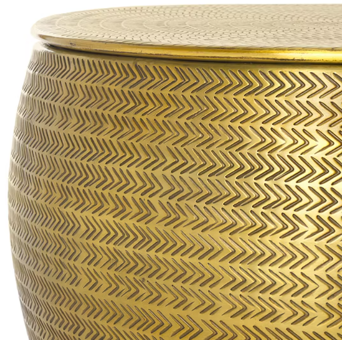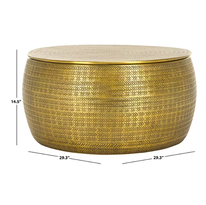 โต๊ะกาแฟแบบดรัมเคลือบผงทองทรงกลมสไตล์วินเทจโต๊ะด้านข้างเคลือบเงาออกแบบด้วยค้อนสำหรับในร่มและกลางแจ้ง