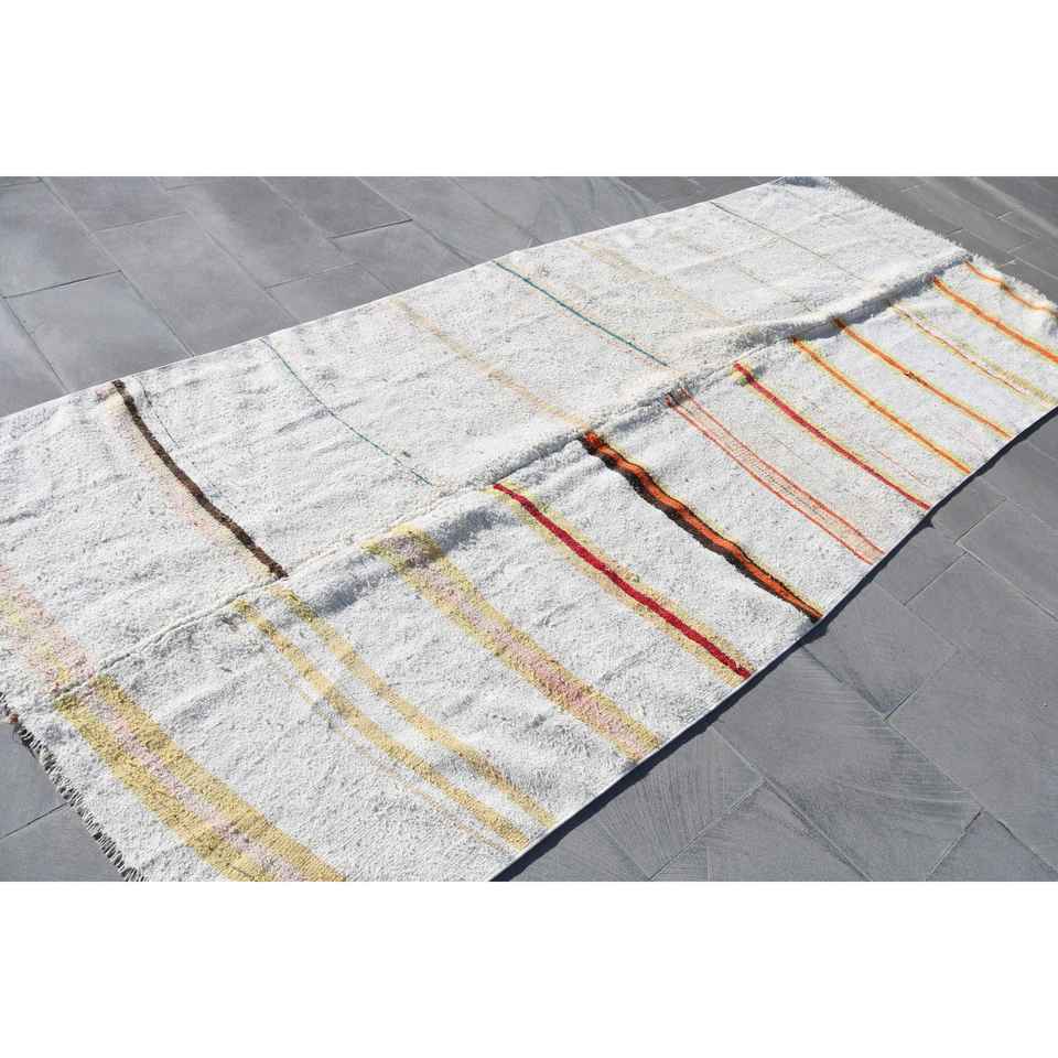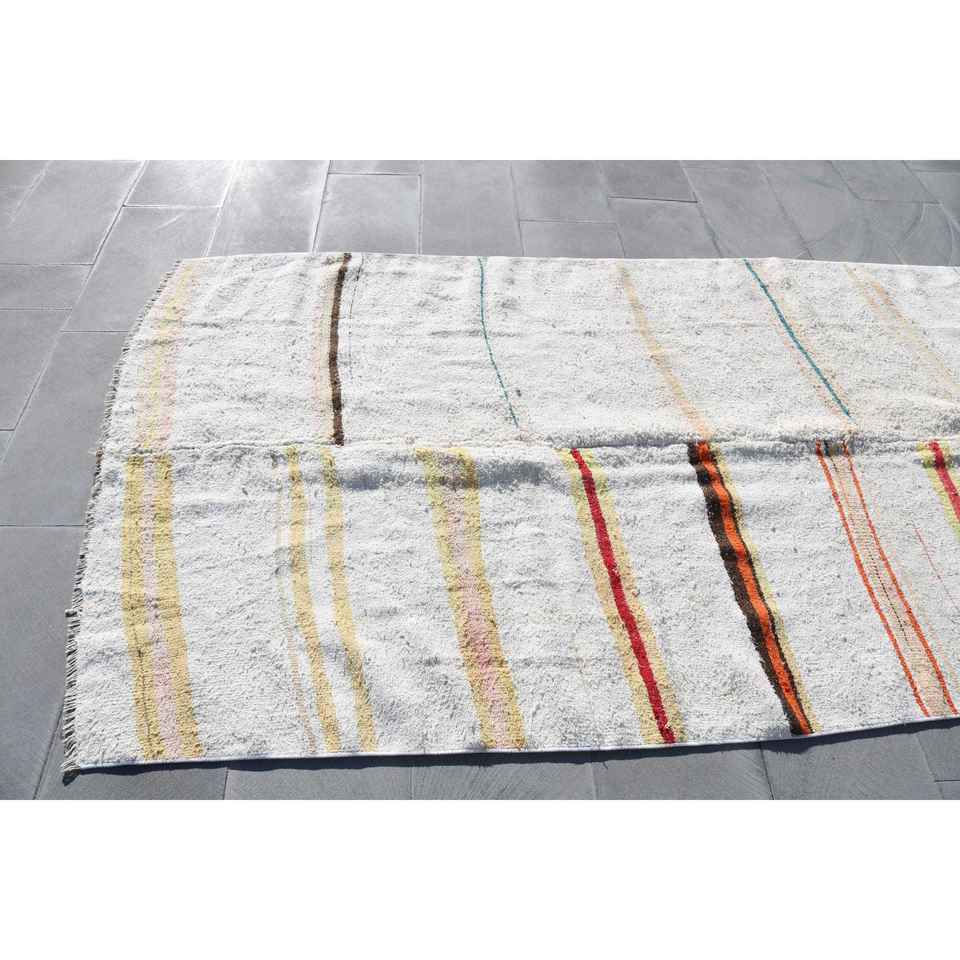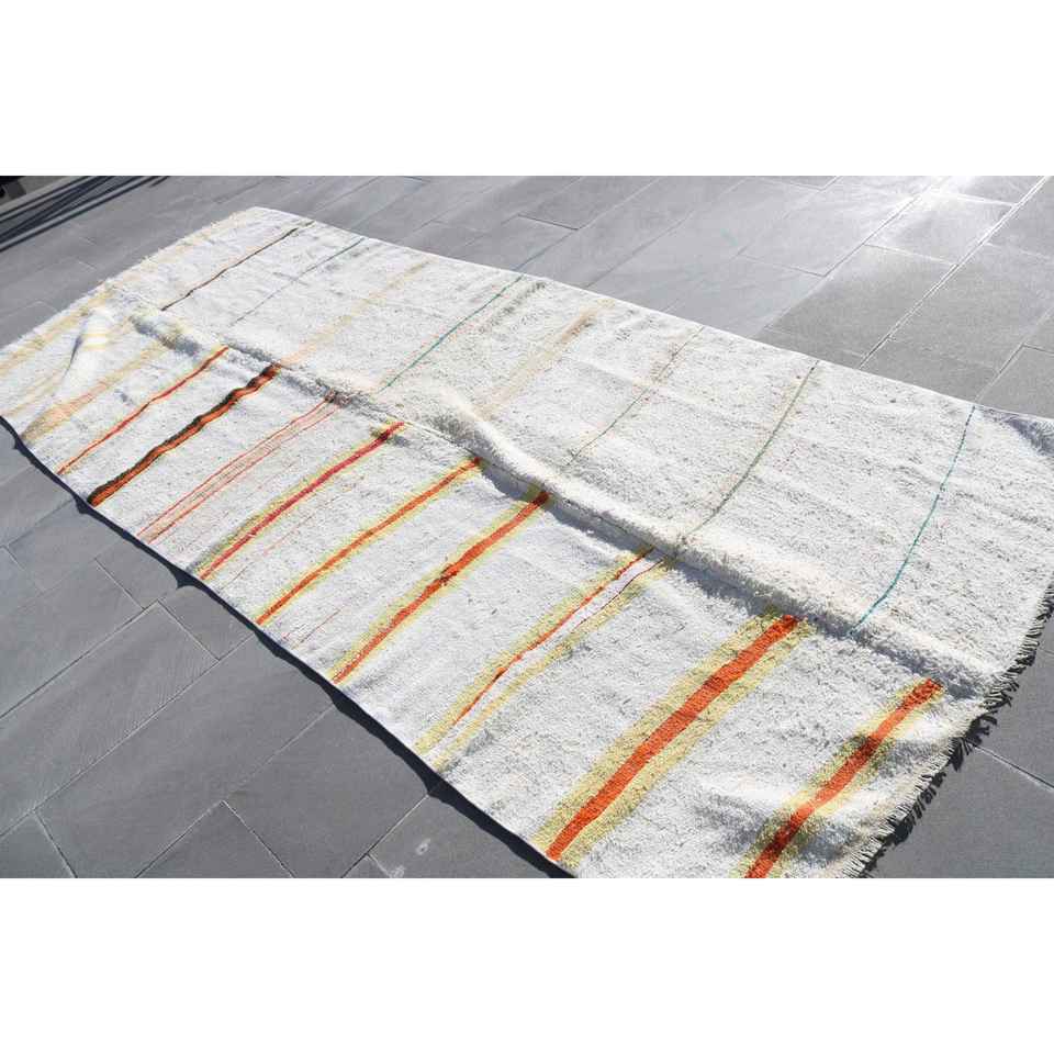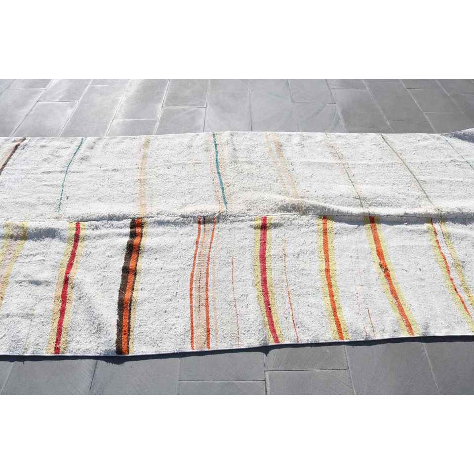 พรมวินเทจ ขนาด 4.7x11.4 ฟุต พรมตุรกี พรมขนสัตว์ลายทางสีขาวส้ม
