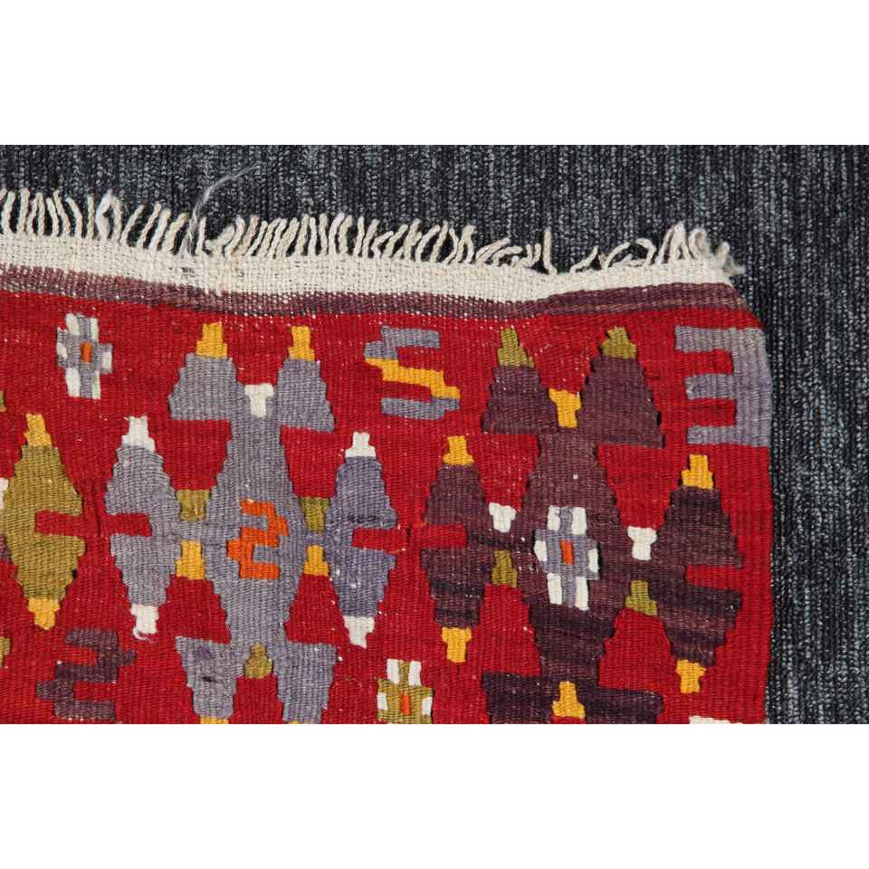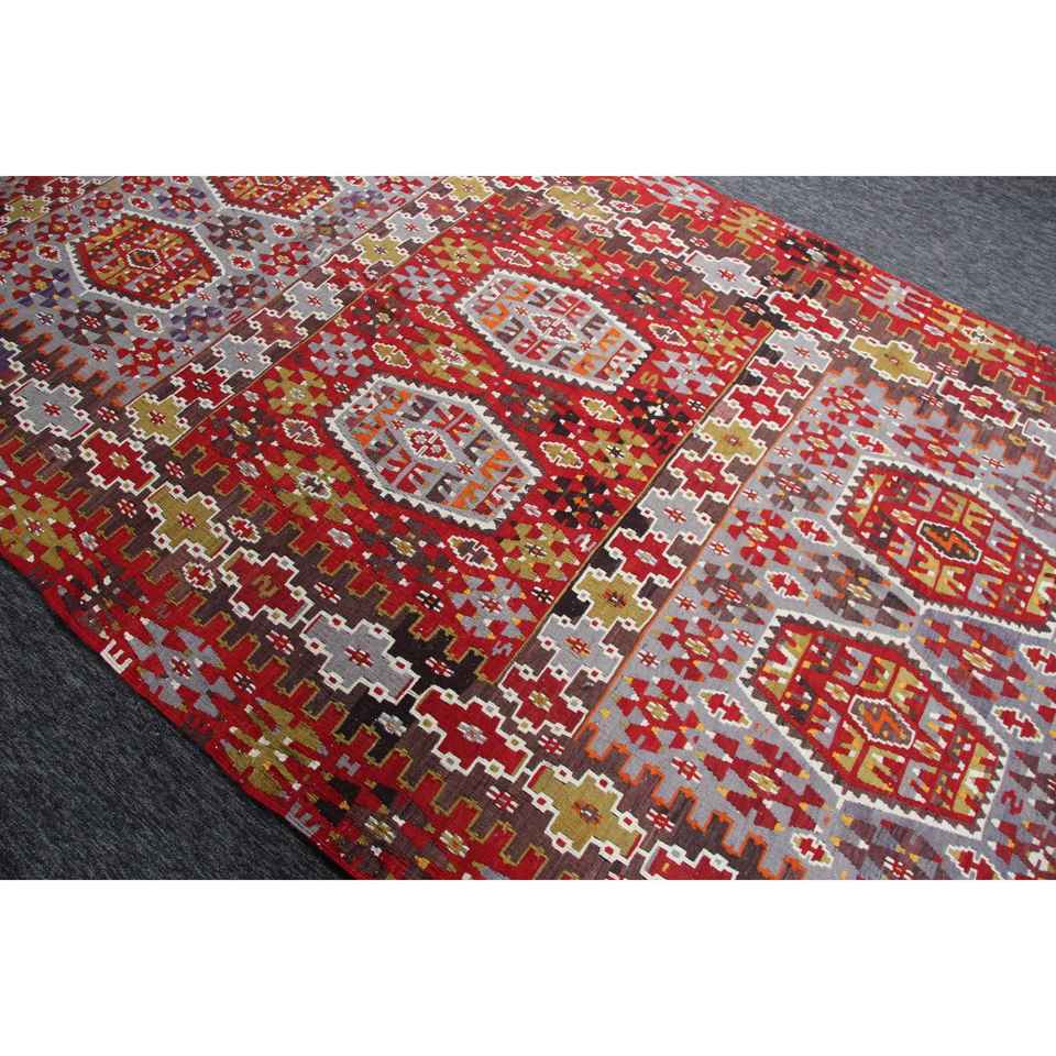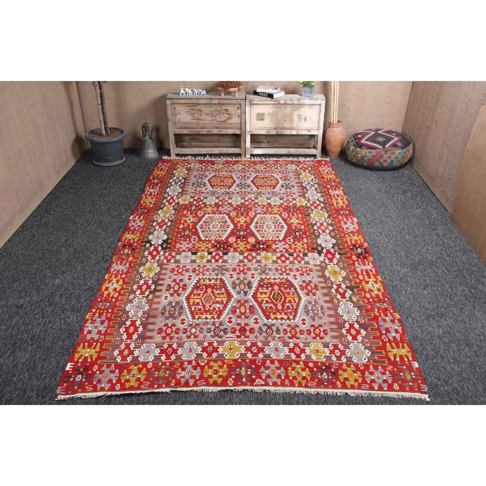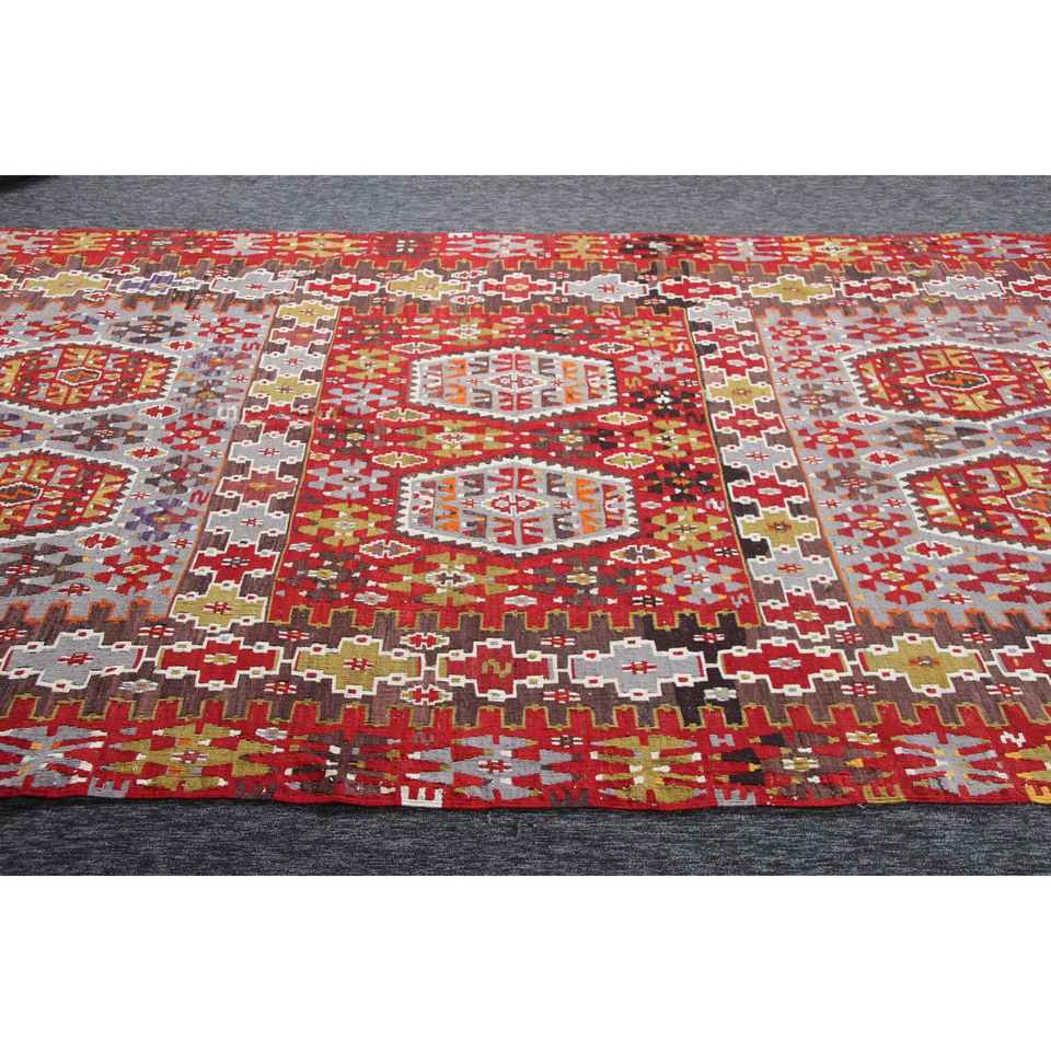 พรมวินเทจ ขนาด 6.1x10.8 ฟุต พรมตุรกี พรมคิลิมสีแดงลายเรขาคณิตสีรุ้ง