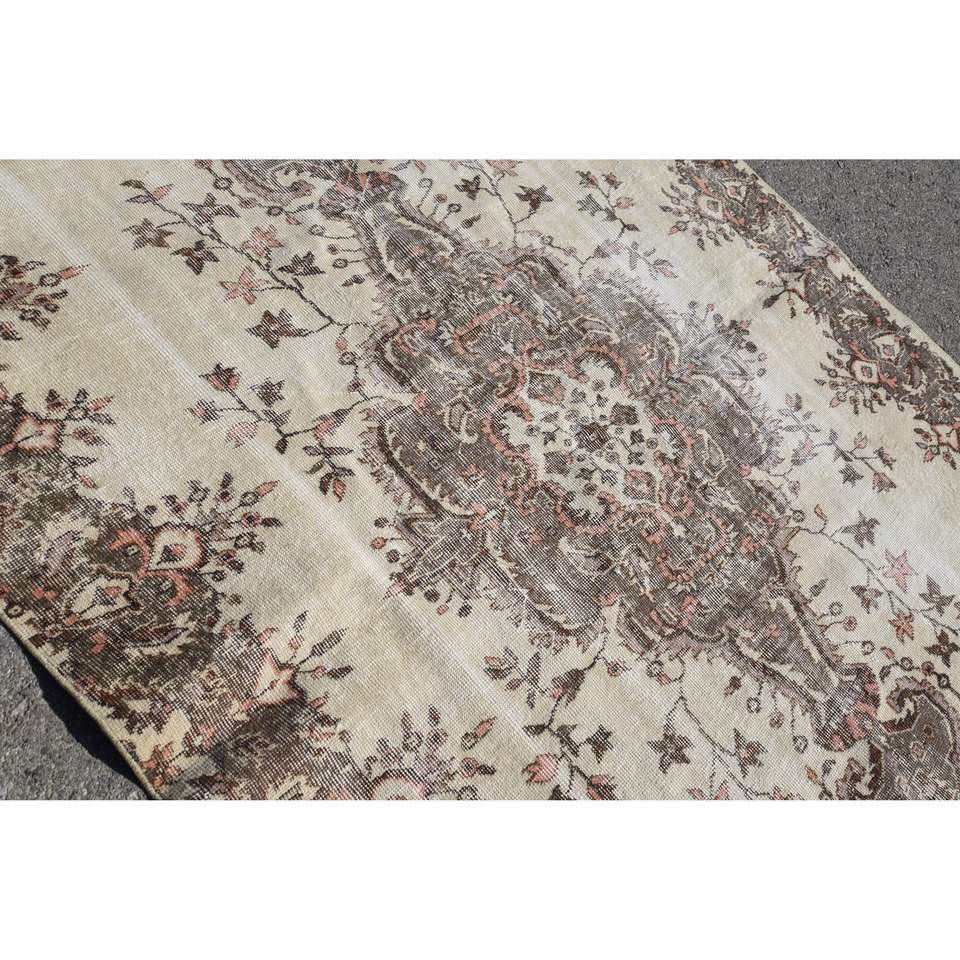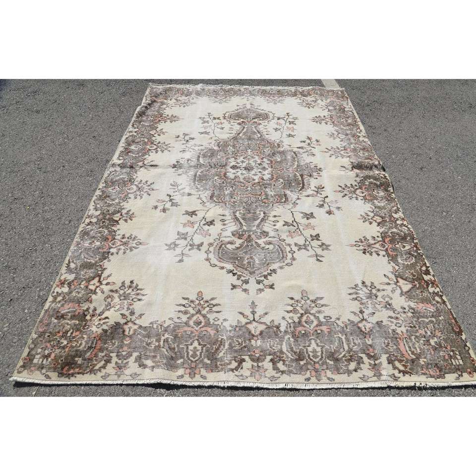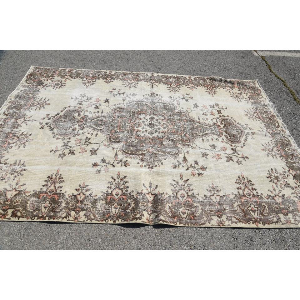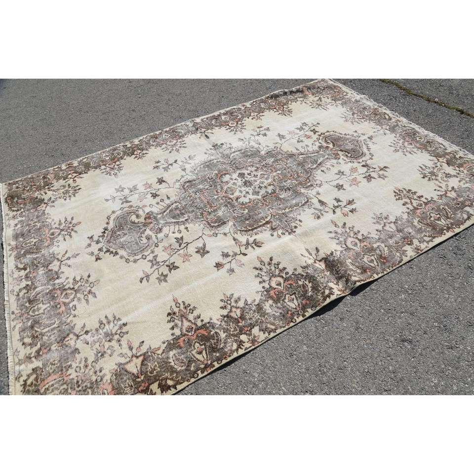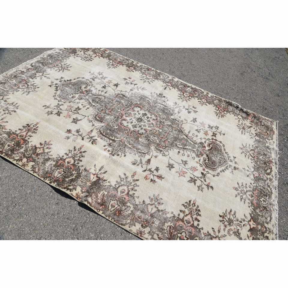 พรมวินเทจ ขนาด 6.1x8.9 ฟุต พรมตุรกี สีเบจเทา ลายดอกไม้ ทำจากขนสัตว์