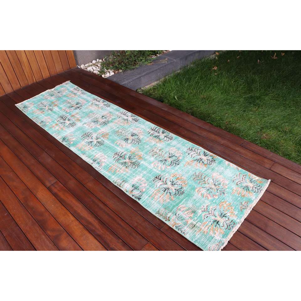 พรมวินเทจลายวิ่งทางยาว 2.2x7.8 ฟุต (66x239 ซม.) สีเขียวตุรกี พรมลายตะวันออก