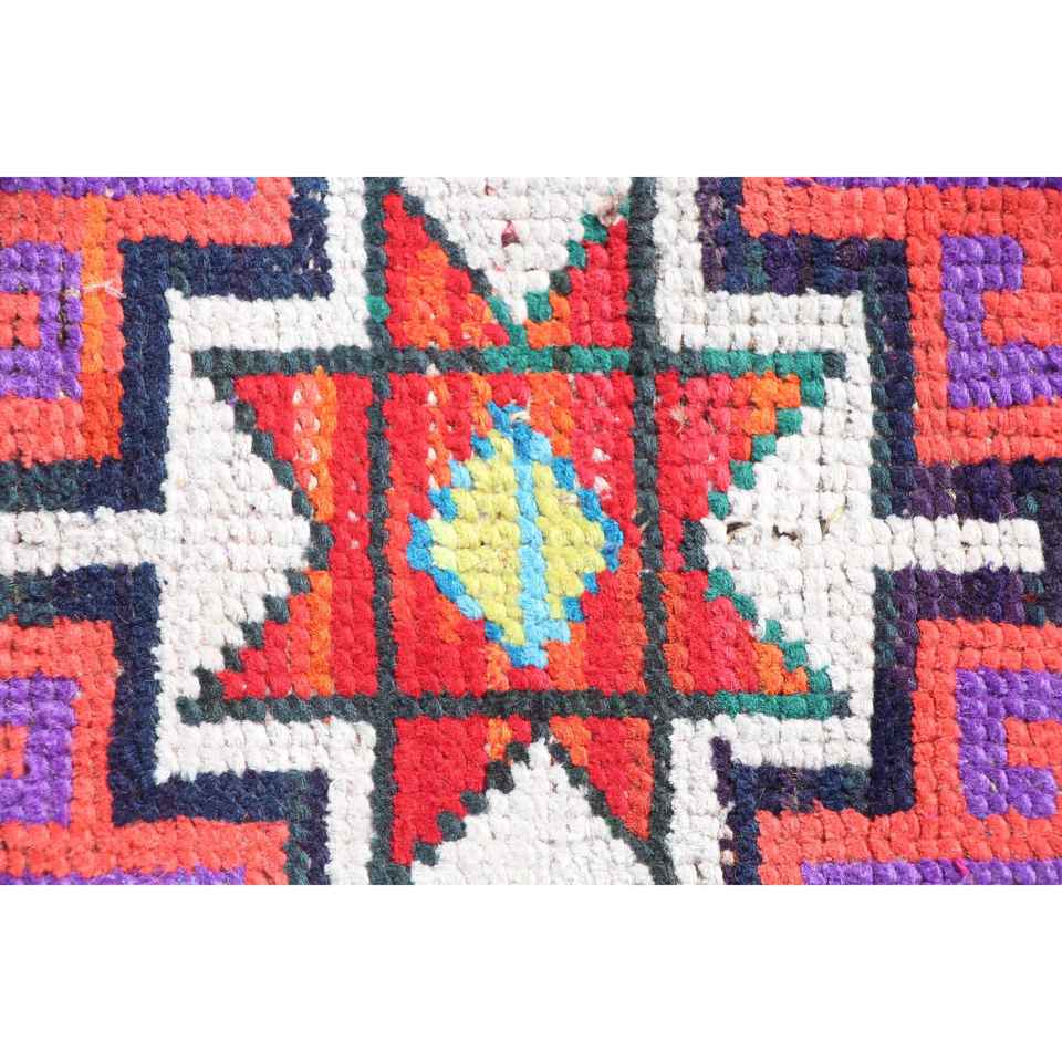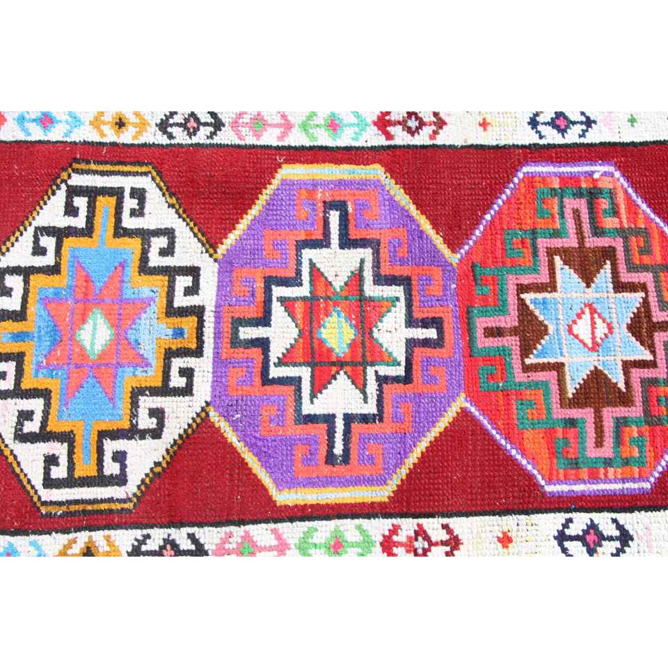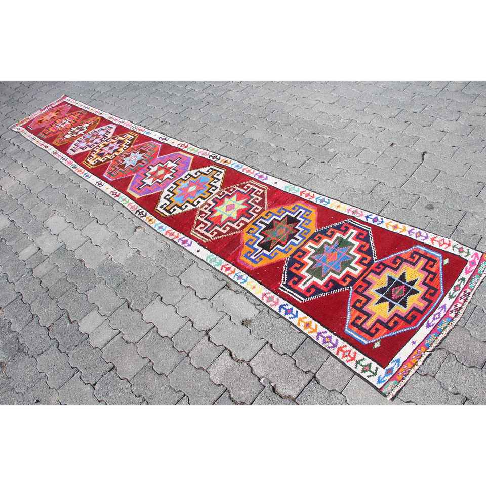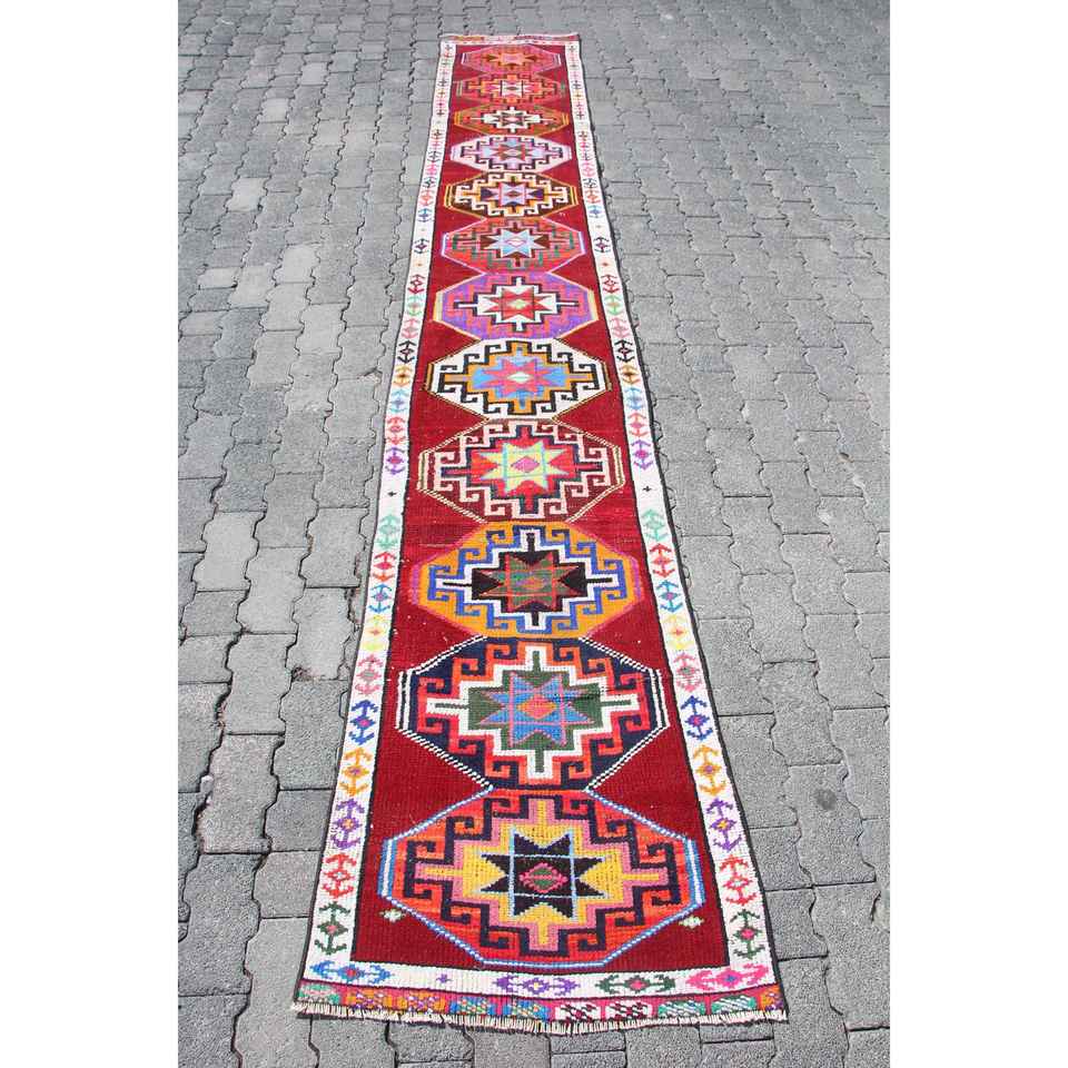 พรมวินเทจลายรันเนอร์ ขนาด 2.3x12.1 ฟุต พรมตุรกี พรมขนสัตว์สีแดงสไตล์เซาท์เวสเทิร์น