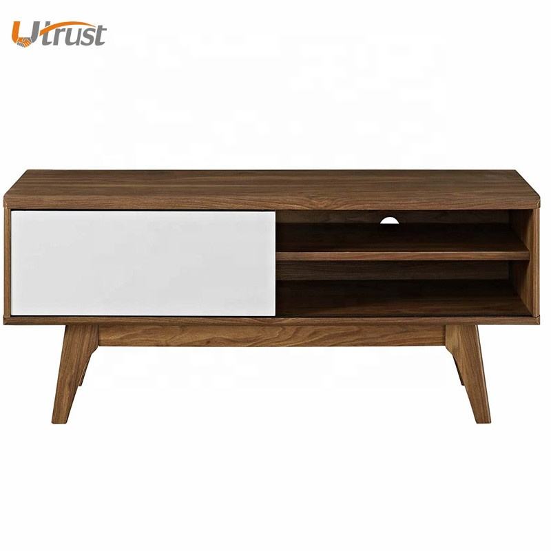 วินเทจชนบทสีน้ำตาลหน่วยทีวีที่ทันสมัยขนาดใหญ่ราคาถูกด้านทีวีสีขาวรวมกันยืนกับ2เปิดชั้นวางจัดเก็บและลิ้นชักสีขาว1