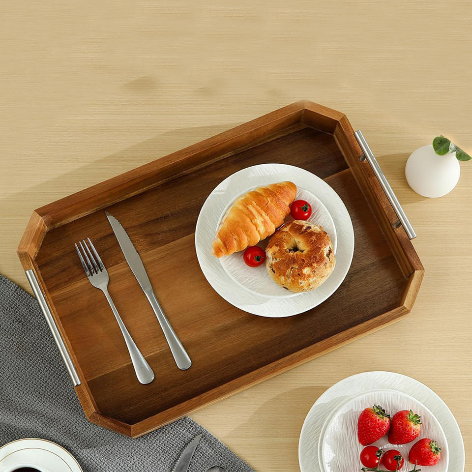 Acacia Wooden Serving Tray with Metal Handles