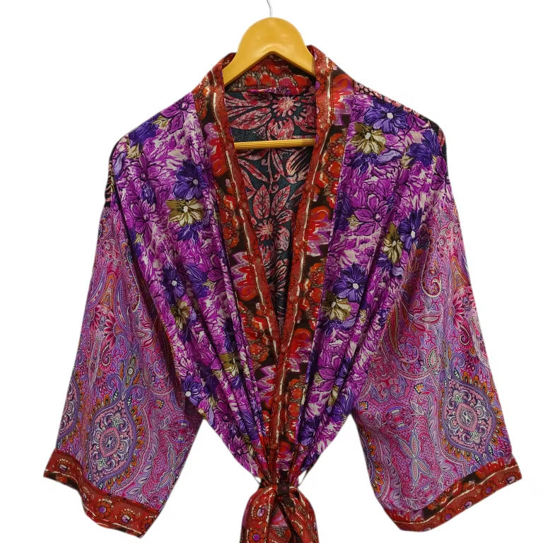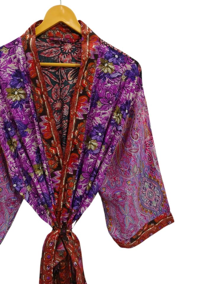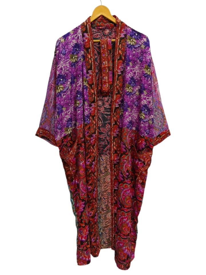ชุดคลุมกิโมโนผ้าไหมซารีวินเทจแบบแพทช์เวิร์ค ชุดคลุมบิกินี่ ชุดนอน ชุดคลุมยาว ทำด้วยมือจากผ้าไหมซารีอินเดียรีไซเคิลวินเทจ
