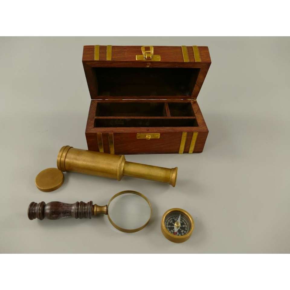 กล้องโทรทรรศน์โบราณสไตล์เรือวินเทจ พร้อมเข็มทิศและแว่นขยาย บรรจุในกล่องไม้สุดหรูสำหรับของขวัญแนวทะเล