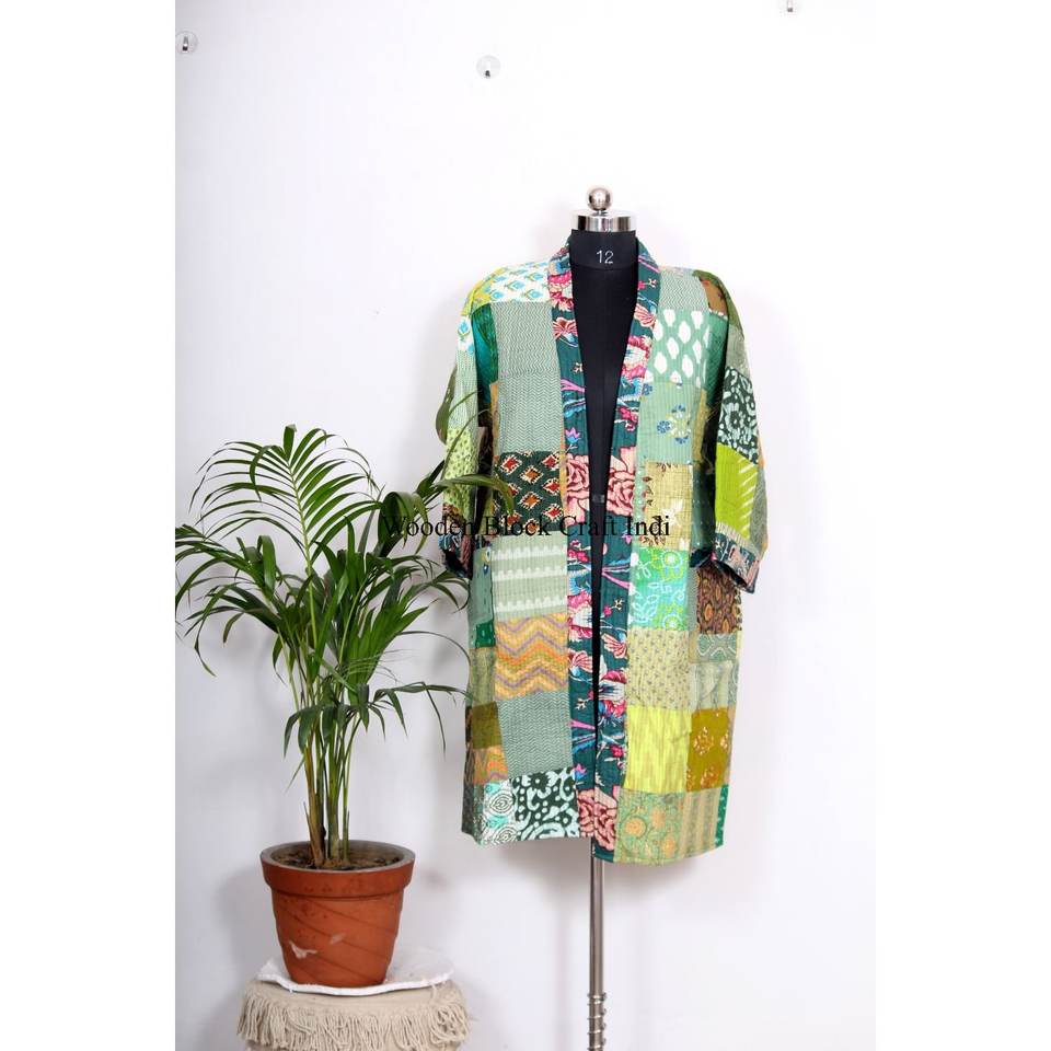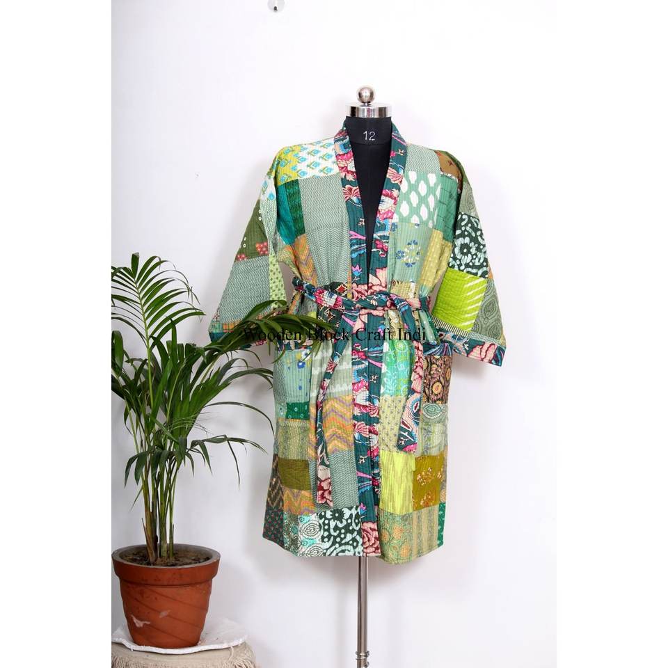 ชุดกิโมโนผ้าไหมวินเทจสไตล์โบฮีเมียน ชุดคลุมสำหรับงานเทศกาล งานฝีมือเย็บปะติดปะต่อจากผ้าส่าหรี ชุดคลุมกิโมโนผ้าไหมรีไซเคิล ชุดคลุมอาบน้ำแบบยูนิเซ็กซ์