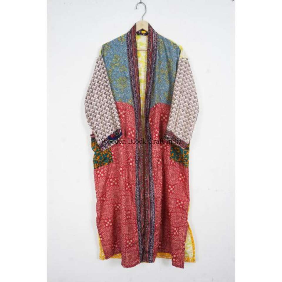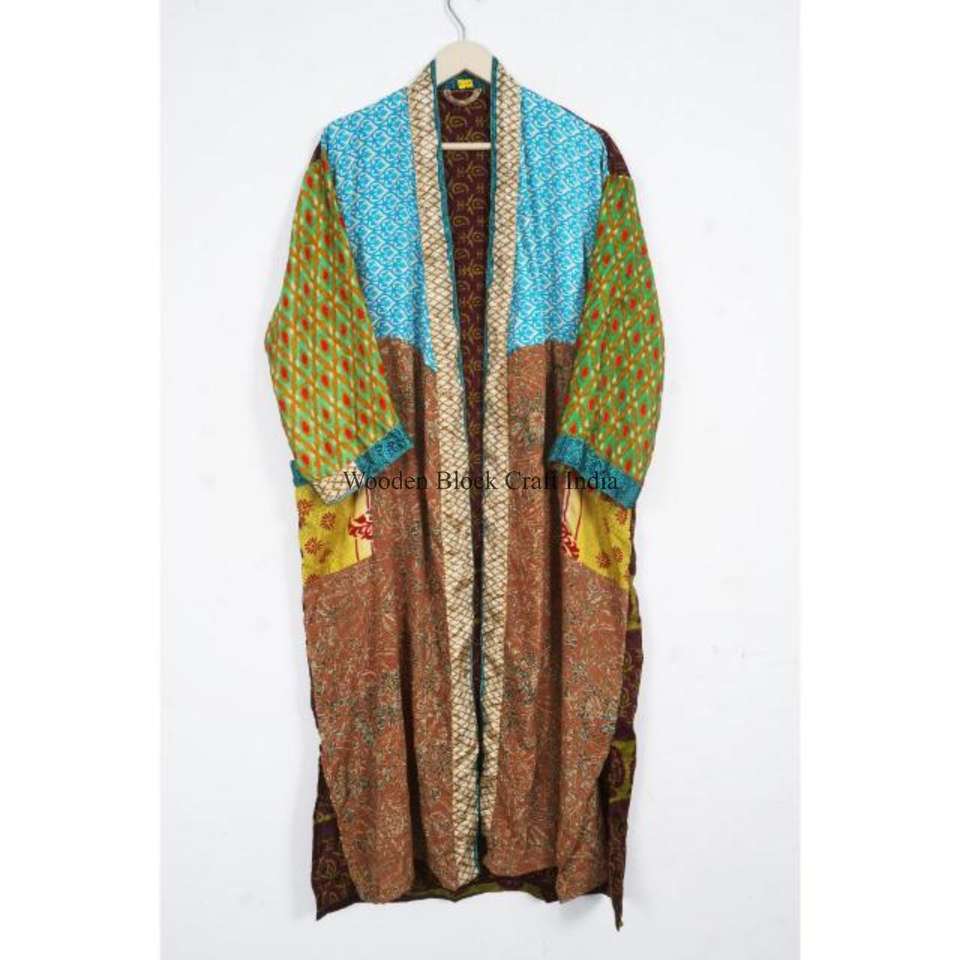 ชุดกิโมโนผ้าไหมลายดอกไม้สไตล์วินเทจ ชุดลำลองโบโฮสำหรับงานเทศกาล ผ้าไหมซารีรีไซเคิลเย็บปะติดปะต่อทำมือ แขนยาวเต็มตัว
