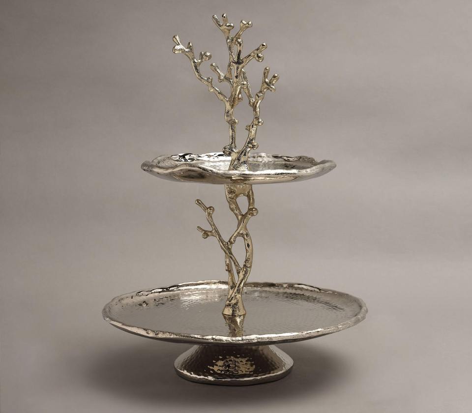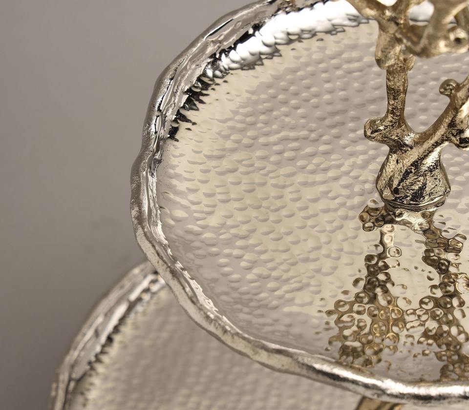 ขาตั้งเค้กโลหะ 2 ชั้น สีเงินวินเทจ พร้อมฐานลายกิ่งไม้สีทอง สำหรับงานแต่งงาน งานเลี้ยง จัดเสิร์ฟผลไม้ และเป็นของขวัญ