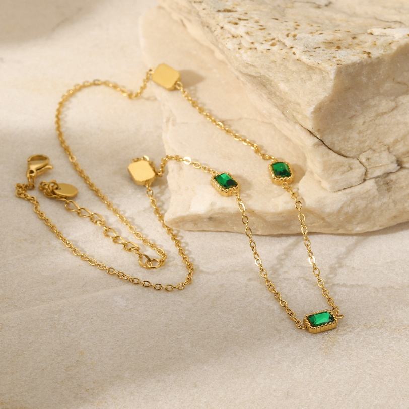 สร้อยคอทรงสี่เหลี่ยมประดับเพทายสีเขียวสไตล์วินเทจ สร้อยคอเหล็กกล้าไร้สนิมชุบทอง 18K สไตล์ INS เครื่องประดับสำหรับผู้หญิง