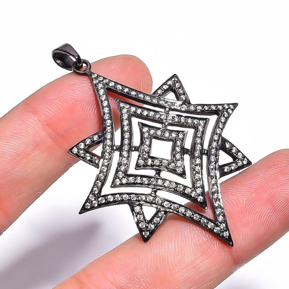 Vintage Star Shape Pendant Oxidized Silver Finish CZ Diamond Look Statement Necklace Jewelry Charm