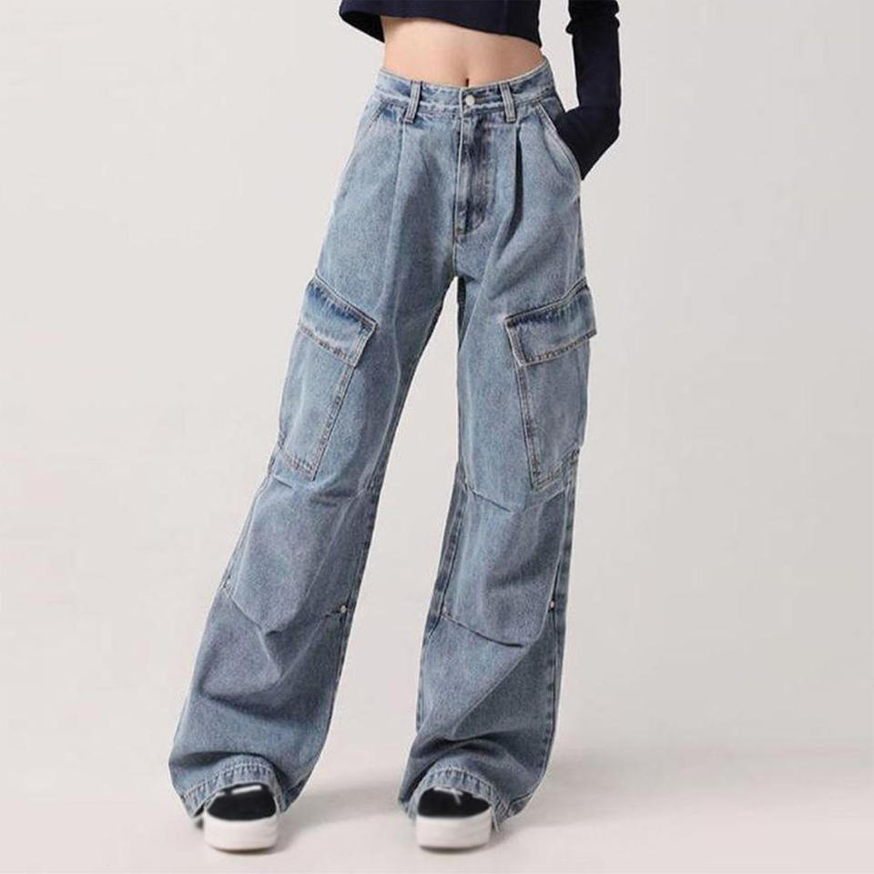 กางเกงยีนส์ขาตรงเอวสูงของผู้หญิงทรงหลวมแนวสตรีทแวร์สไตล์วินเทจ