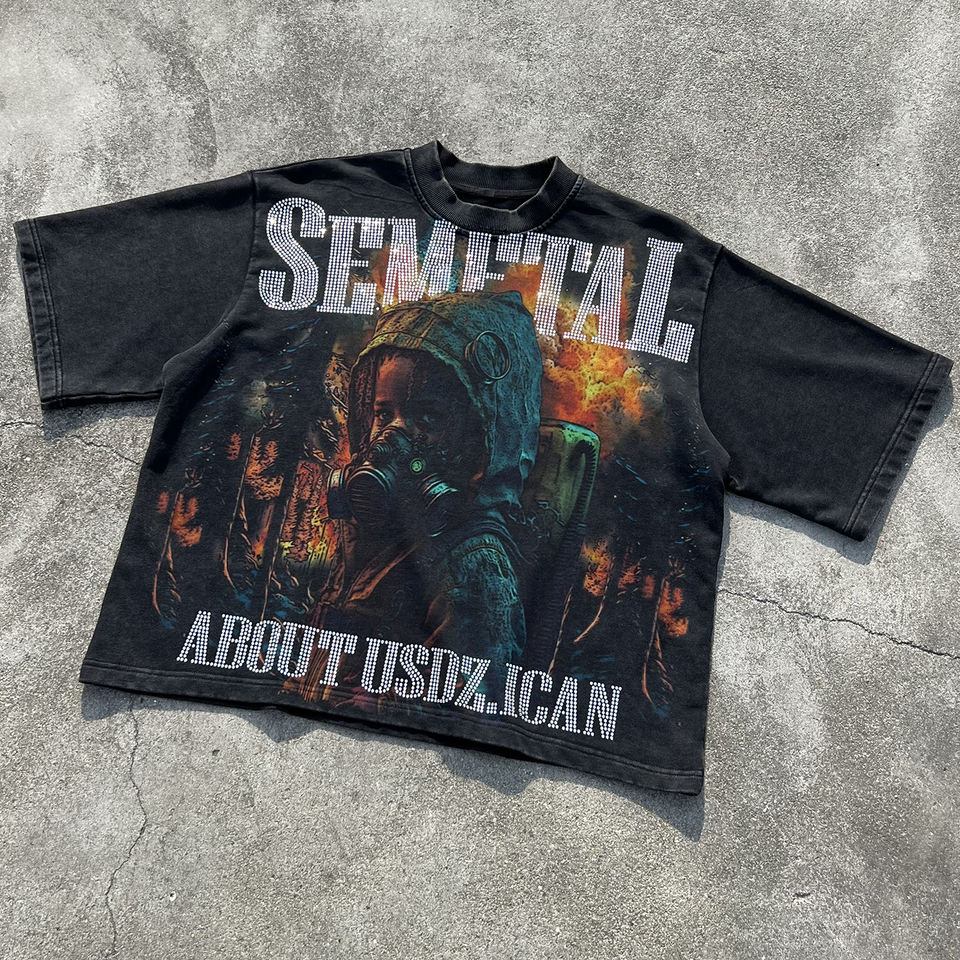 เสื้อยืดสตรีทแวร์วินเทจประดับเพชร ลายพิมพ์กราฟิกขนาดใหญ่ สไตล์ดิสเทรส คุณภาพสูง ซักย้อมสีแบบแอซิดวอช สำหรับผู้ชาย