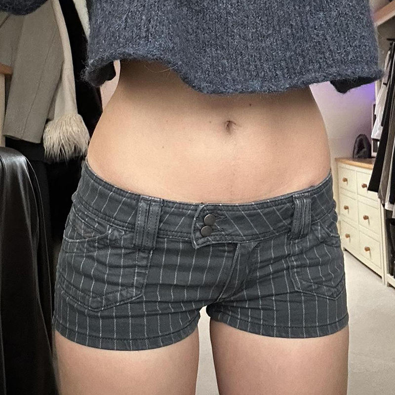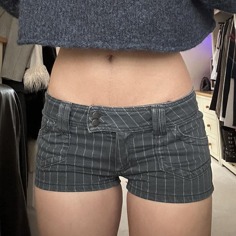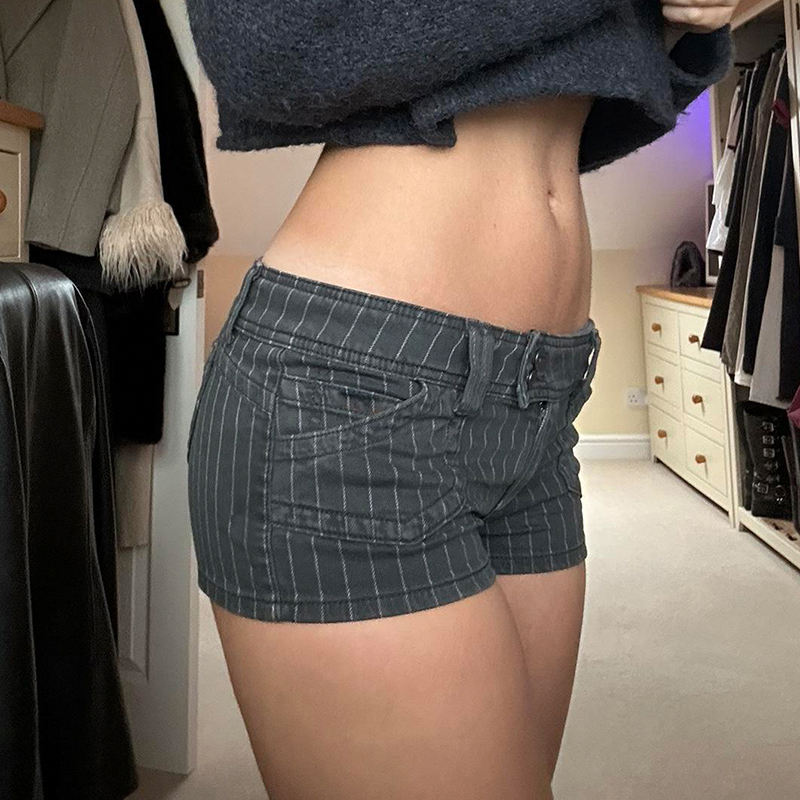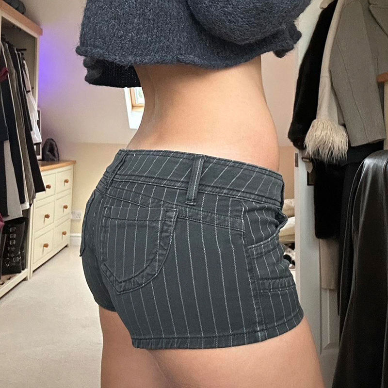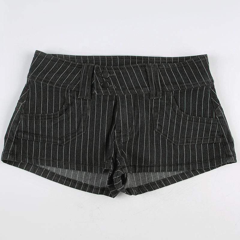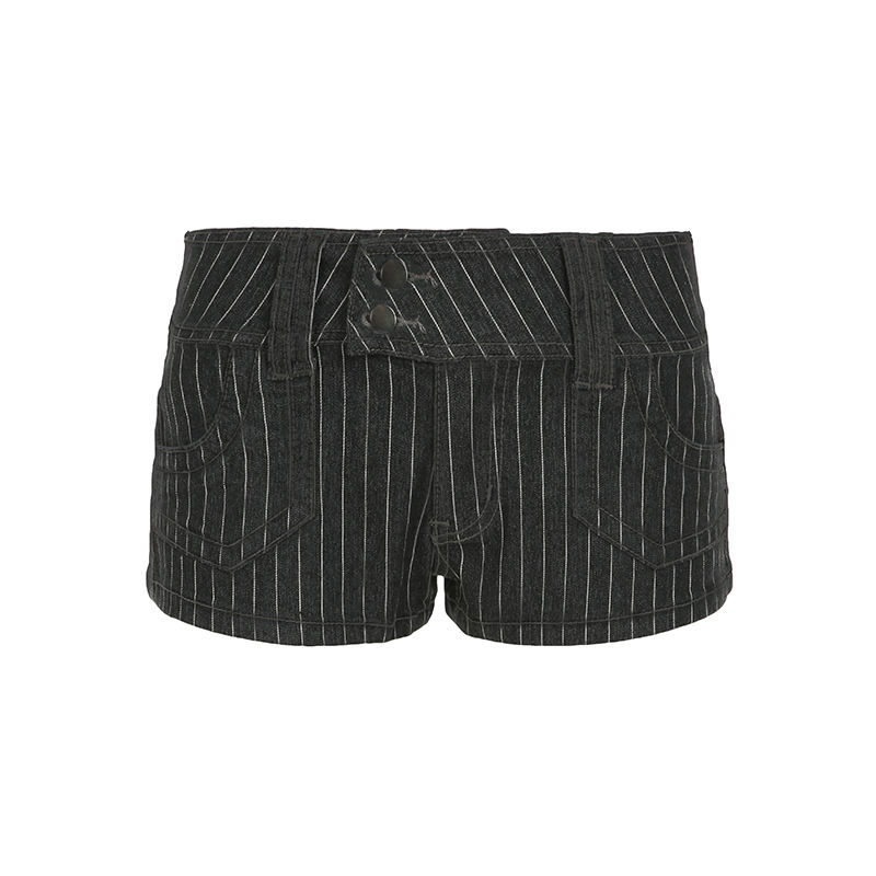 กางเกงยีนส์ขาสั้นผู้หญิงทรงตรงสไตล์วินเทจลายทางสีดำเอวต่ำมีกระเป๋าใส่ของทรงปกติสไตล์สตรีทแวร์ลำลองสปอร์ตสำหรับฤดูร้อน