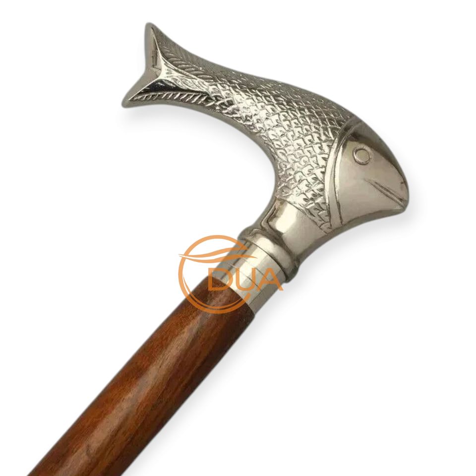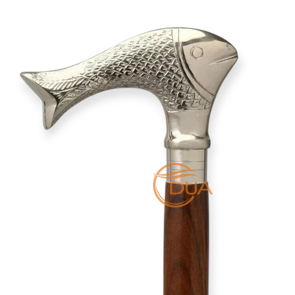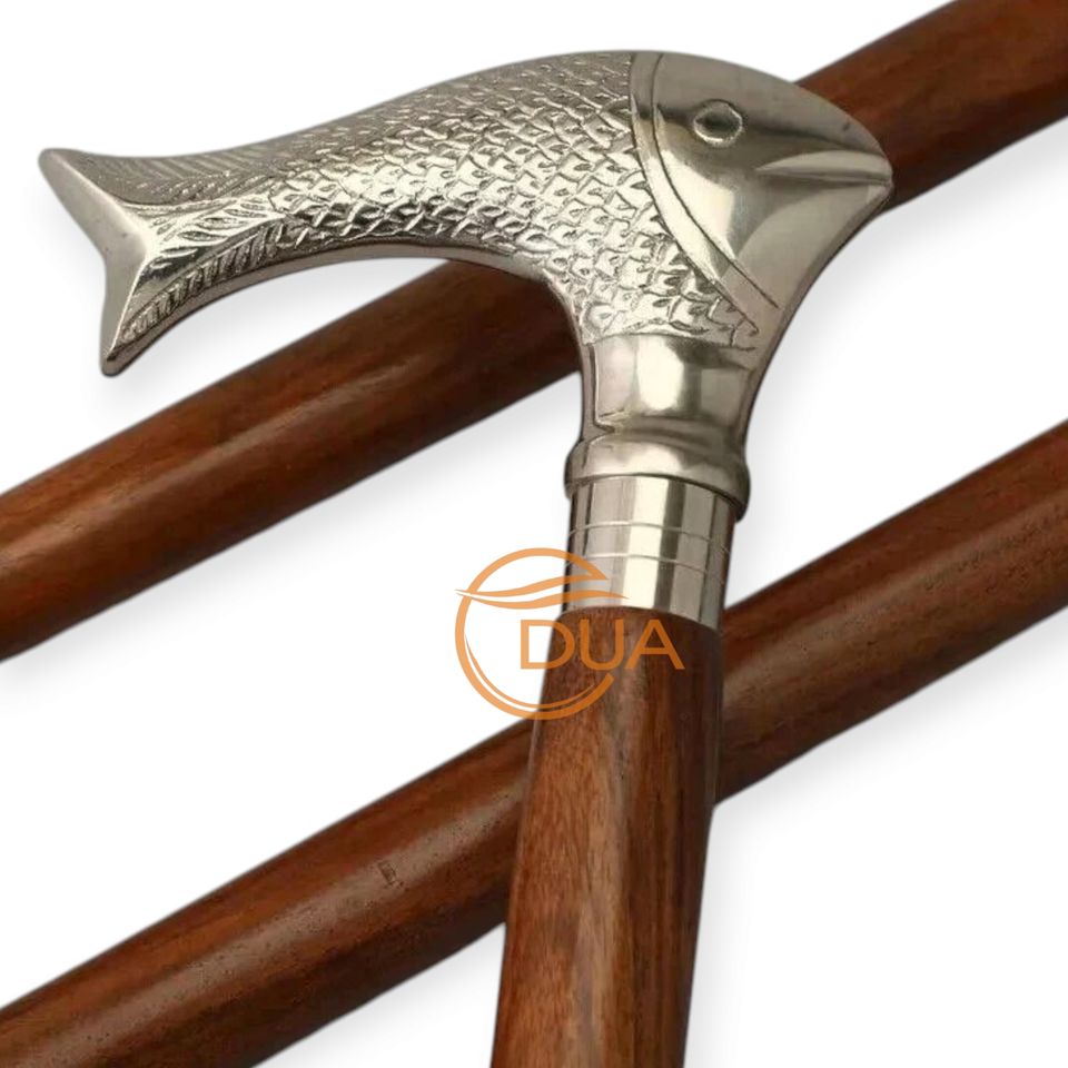 ไม้เท้าเดิน3ส่วนสไตล์วินเทจน้ำหนักเบาทันสมัยทำจากทองเหลืองและไม้พร้อมที่จับหัวปลาสีเงินปลายเหล็กสำหรับการปีนเขา