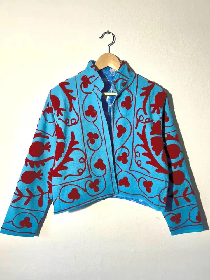 แจ็คเก็ตสั้นโบฮีเมียนสไตล์วินเทจทำด้วยมือผ้าฝ้ายสีเทอร์ควอยซ์ suzani เสื้อเอวลอยออกแบบปักสำหรับเทศกาลฤดูหนาว