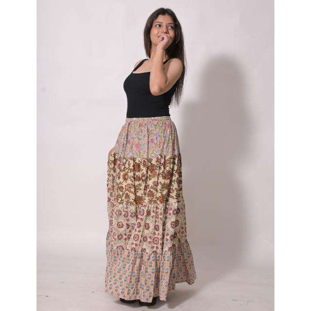 กระโปรงยาวสไตล์วินเทจผ้าฝ้ายปะติดปะต่อพิมพ์ลายบล็อก โบโฮ แม็กซี่สเกิร์ต ทำมือสำหรับผู้หญิง ใส่ไปงานเทศกาล ดีไซน์จีบ ซักได้