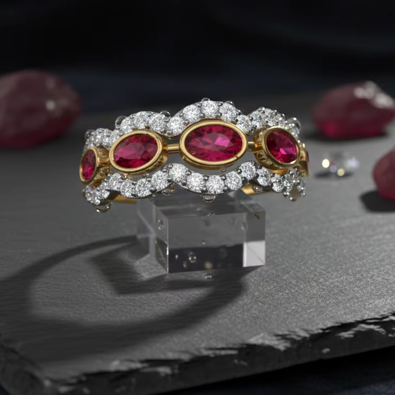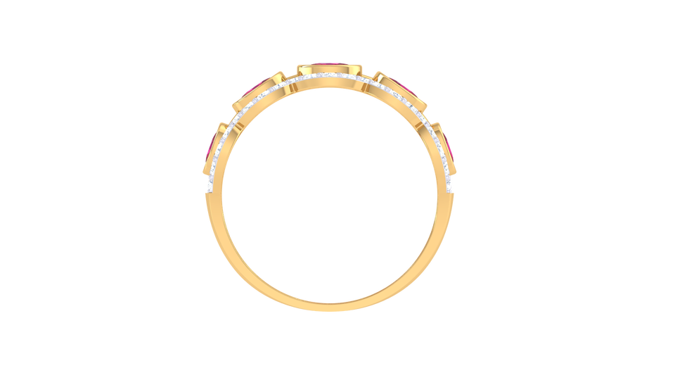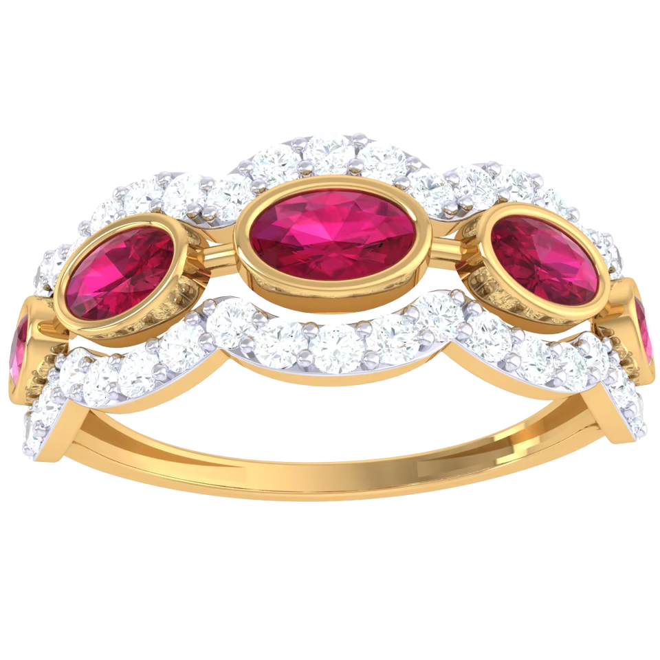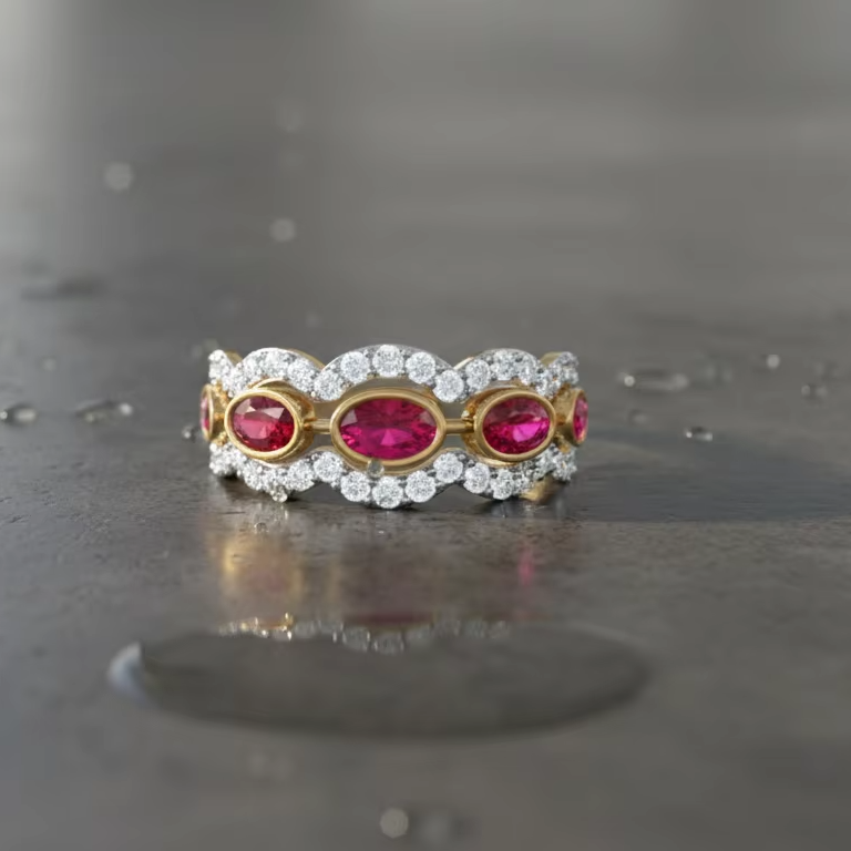 แหวนทองรูปวงรีลายคลื่นสไตล์วินเทจประดับเพชรพร้อมแถบคริสตัลสีชมพูสำหรับวันครบรอบ