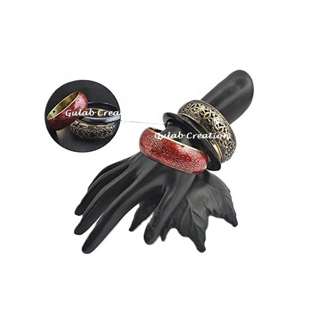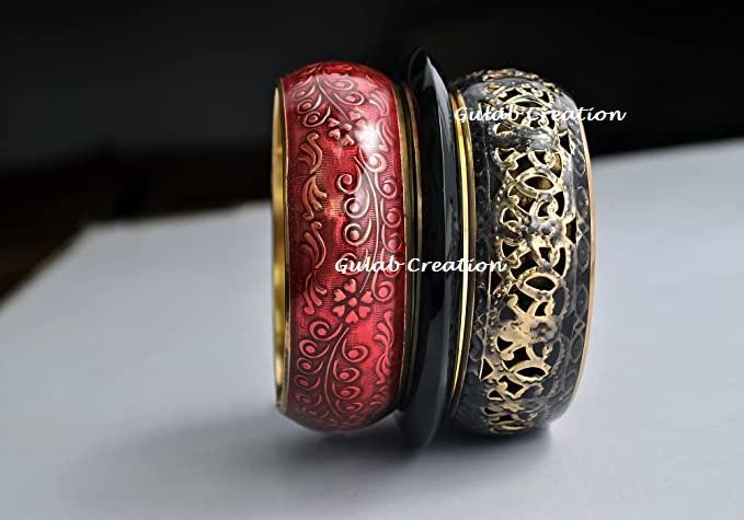 ชุดกำไลเคลือบทองเหลืองแกะสลักสไตล์วินเทจ | กำไลโลหะทำด้วยมือสีแดงและสีดำมีดีไซน์ลายดอกไม้และลายเส้น