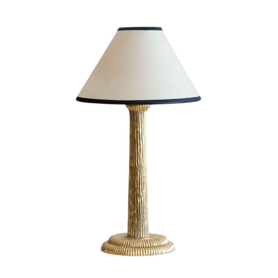โคมไฟตั้งโต๊ะทองเหลืองสไตล์วินเทจ ตกแต่งด้วยผ้าสีครีมทรงกรวยและขอบสีดำ เหมาะสำหรับตกแต่งบ้าน ห้องนอนข้างเตียง และโรงแรม