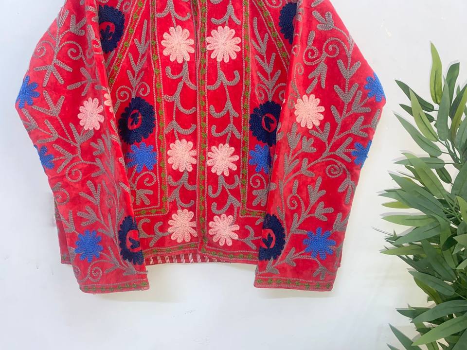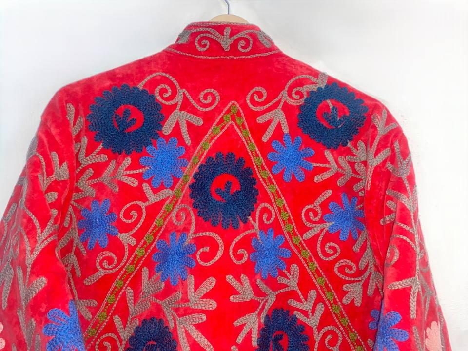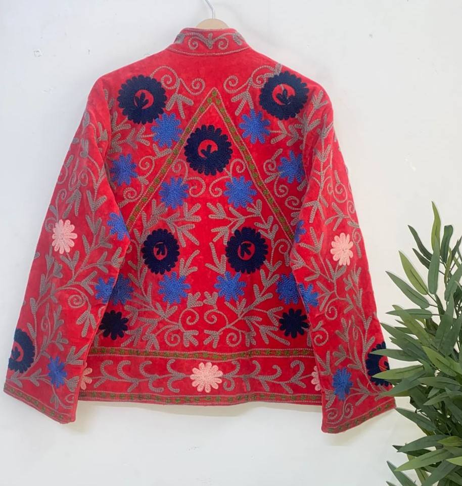 เสื้อแจ็คเก็ตกำมะหยี่สีแดงสไตล์วินเทจ – เสื้อคลุมปักลายพฤกษศาสตร์หลากสีสันแบบแฮนด์เมด