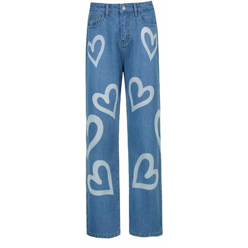 Vintage Style Women's High Waist Heart Print Wide Leg Loose Fit Boyfriend Jeans Streetwear Denim Pants for Teen Girls