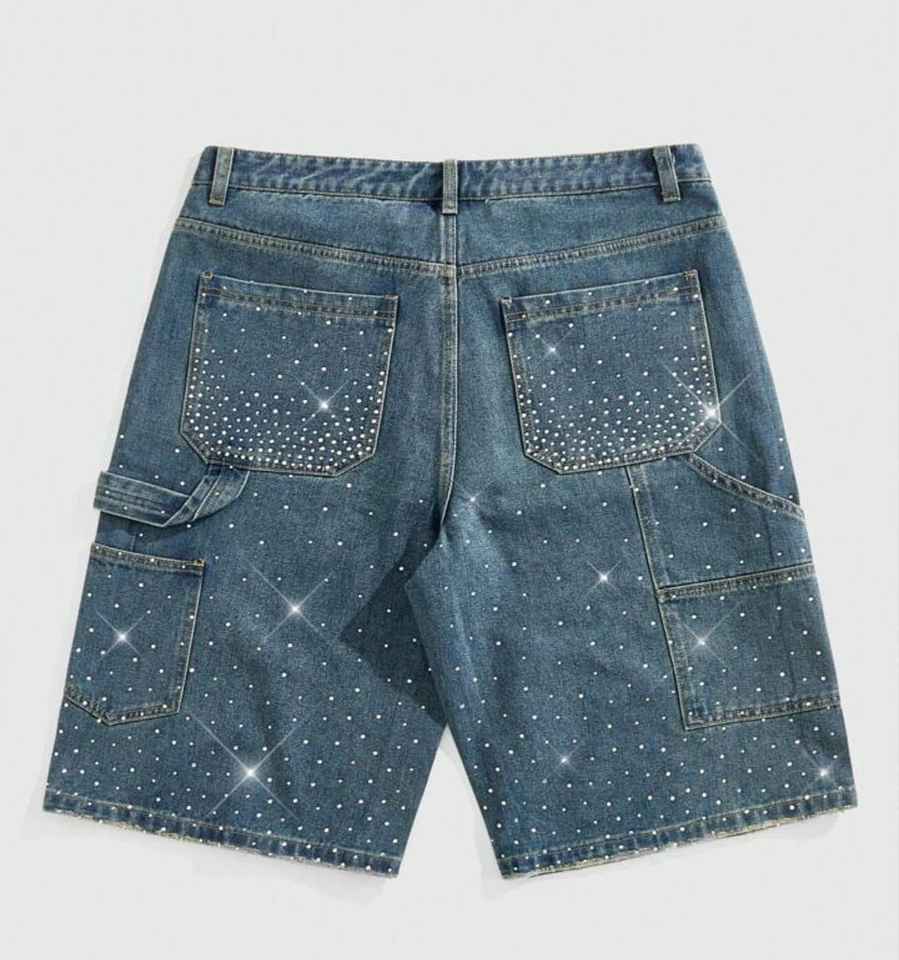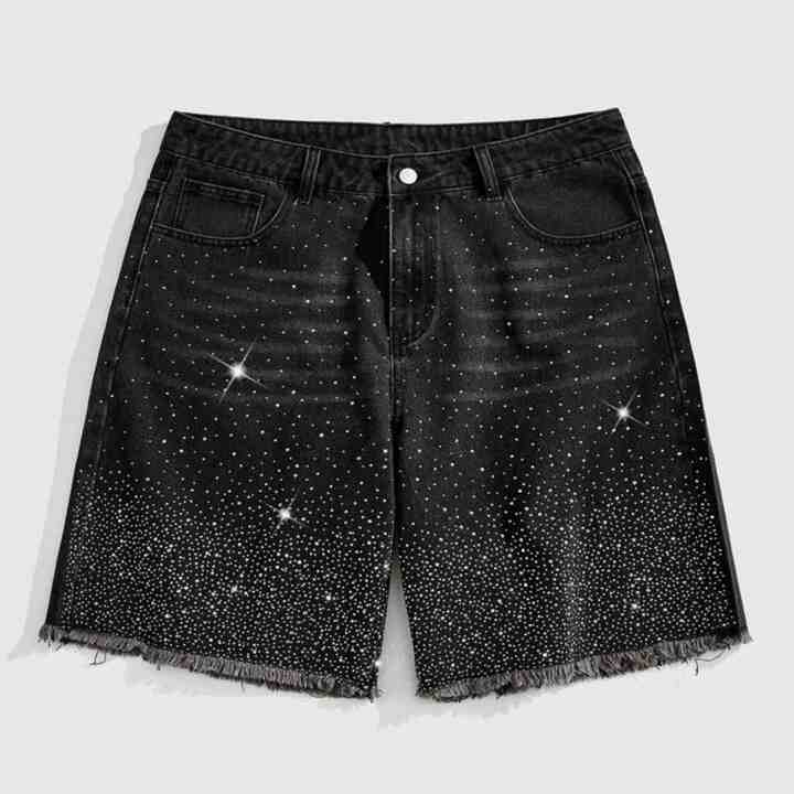 กางเกงยีนส์ขาสั้นผู้ชายสไตล์วินเทจ ผ้าฝ้ายขอบดิบ แต่งซิป ทำตามสั่ง ประดับด้วยคริสตัล
