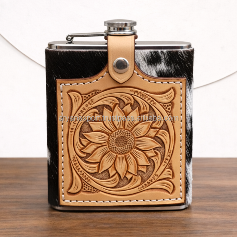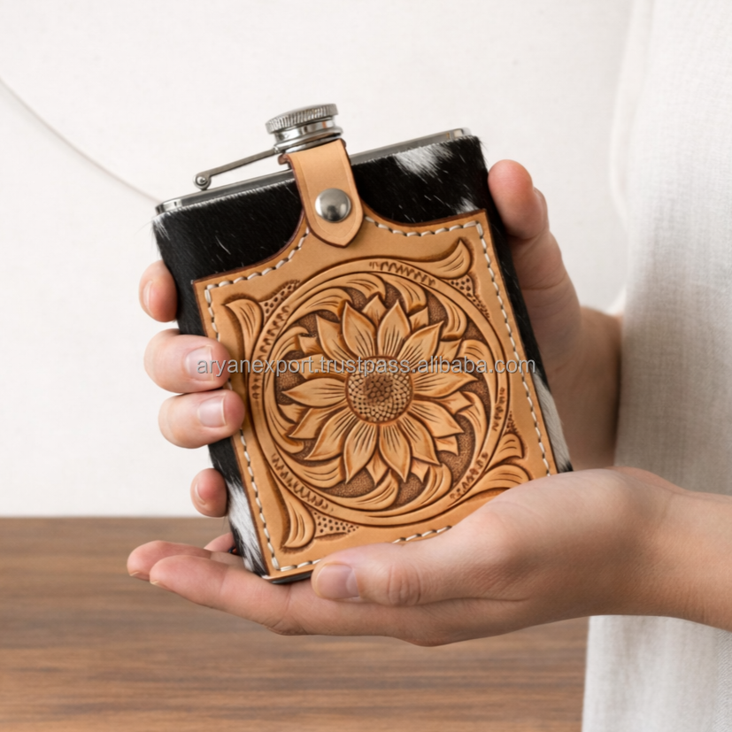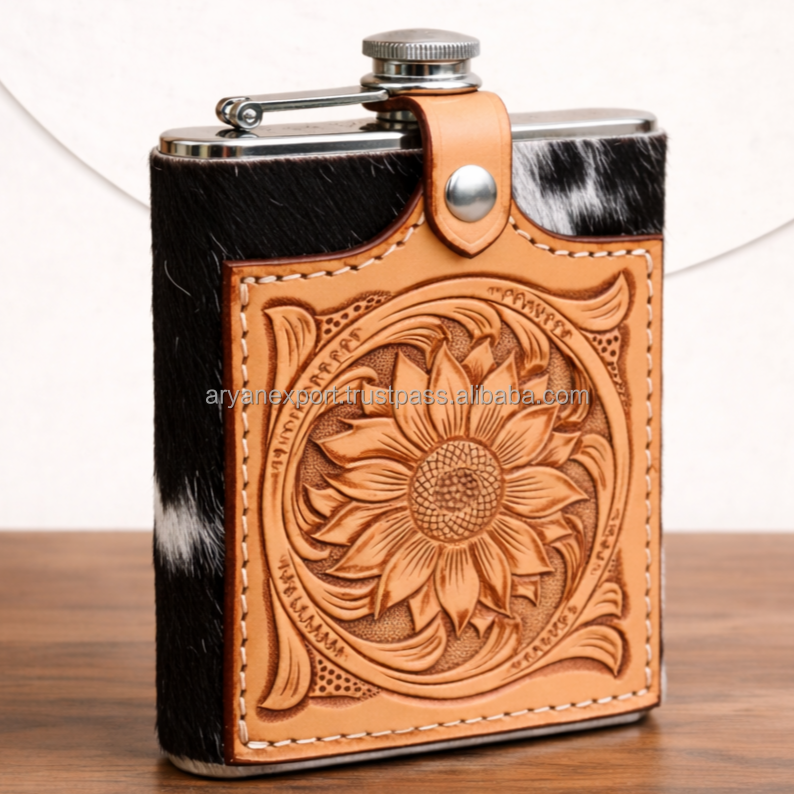 Vintage Tooled Leather Wrapped Stainless Steel Hip Flask Cover Engraved Floral Portable Whiskey Flask Sleeve Gift for Men