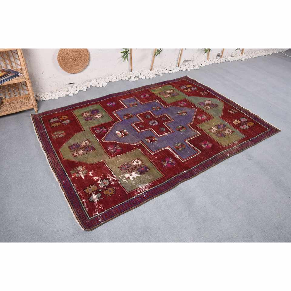 พรมขนสัตว์ทรงเรขาคณิตสีแดงและเขียวเป็นมิตรกับสิ่งแวดล้อมแนววินเทจแบบดั้งเดิม4.8 'x 6.9'