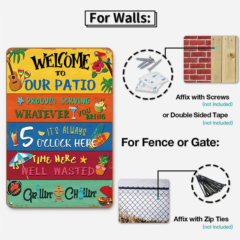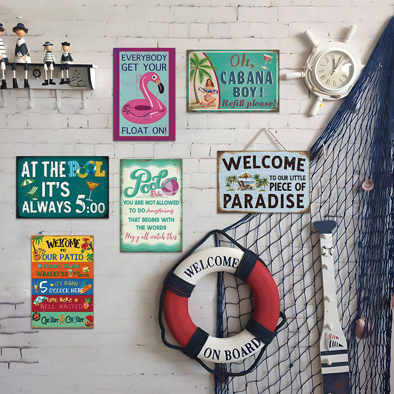 ป้ายโลหะวินเทจลายชายหาดเขตร้อนสไตล์เรโทร ตกแต่งผนังสำหรับบาร์ทีกิ ริมสระน้ำ บ้านริมชายหาด
