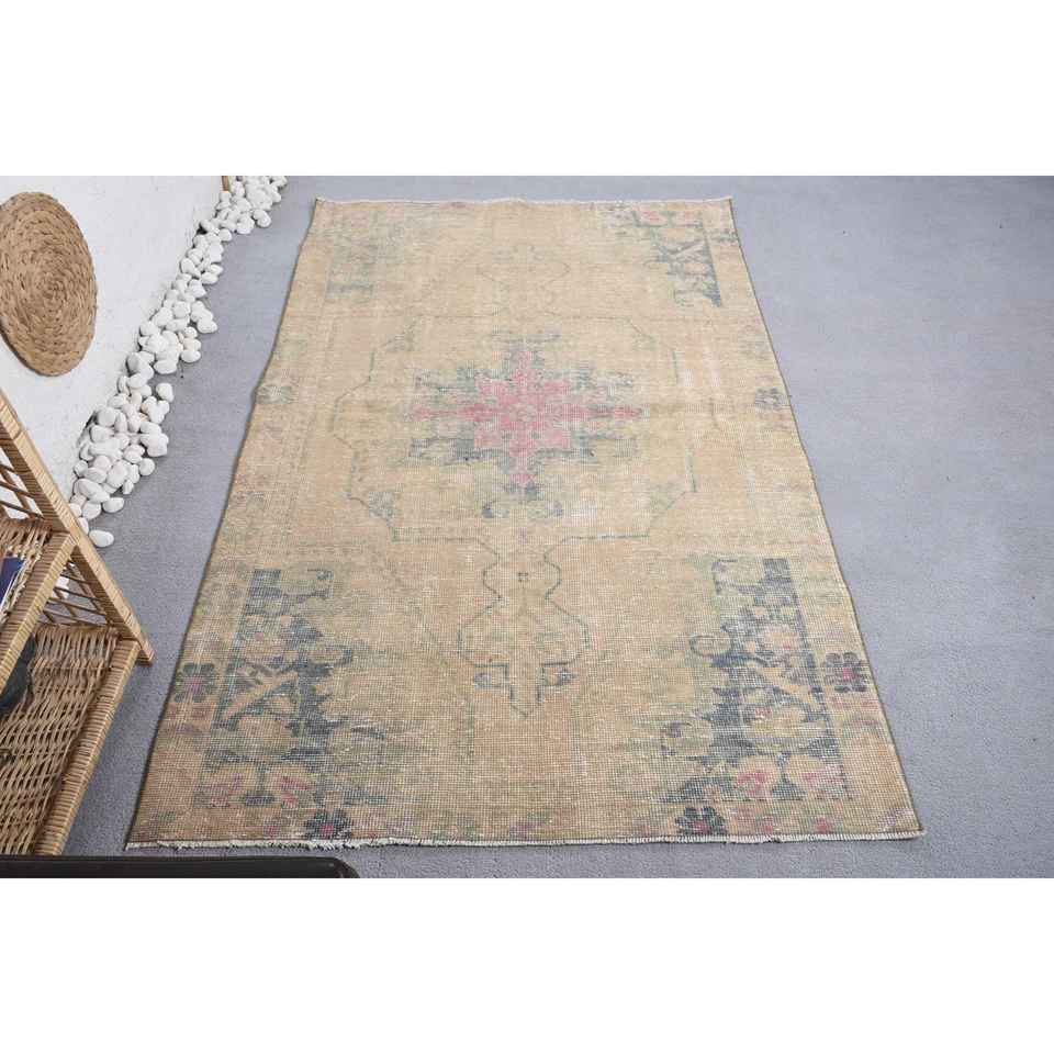 พรมขนสัตว์ทำมือสไตล์ตุรกีวินเทจ, พรมห้องนั่งเล่น6.7ft x 4.2สี่เหลี่ยมผืนผ้าเย็บปะติดปะต่อกันสีชมพูสีเบจ